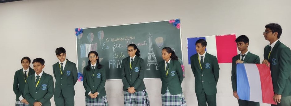 The French National Day is the anniversary of the Storming of the Bastille on 14 July 1789, a major event of the French Revolution, as well as the Fête de la Fédération that celebrated the unity of the French people on 14 July 1790. Celebrations are held throughout France. We from VYDEHI SCHOOL OF EXCELLENCE – DEPARTMENT OF FRENCH Proudly represented Bastille Day reporting A MASS PARADE as in Champs-Élysées, regimented by our Dear principal Ms. Sinia Sajith along with our Headmistresses of Middle School Ms.Viritha and Secondary School Ms. Chhavi and other French students, teacher and parents.