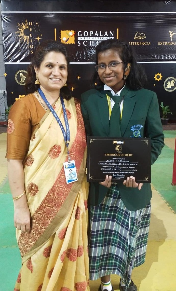 Poetry lifts the veil from the hidden beauty of the world and makes familiar objects be as if they were not familiar. Poetry is what makes you laugh, cry, prickle, be silent and make our toenails twinkle. It gives our imagination wings to fly. It makes our heart fill with bliss and positivity. An Inter school competition was organized by Gopalan International School. Vydehi School participated in Calliope- a poetry writing competition on the theme Haiku Poetry. Haiku poetry is a Japanese poetic form that consists of three lines, with five syllables in the first line, seven in the second line and five in the third. The judgement was done on the basis of creativity, originality and format. The students participated with gusto and vivacity and not to mention that the vydehians never fail to make us proud. Joana Verghese of Grade 8 secured the second position. Acclamation and glory goes to the winner.