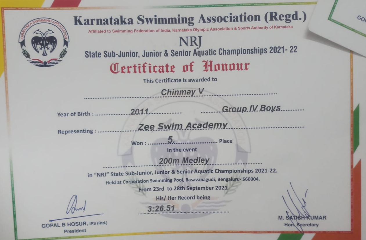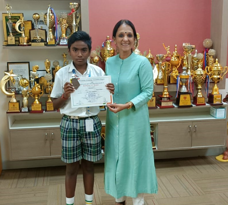 We are very proud to announce that our proud and energetic Vydehian swimmer, Chinmay V, has participated in the competition and has secured 5th position both in 200 metre medley and 100 metre backstroke. He has also secured 7th position in 100 metre free style and 50 metre free style respectively. It was a display of beautiful athleticism and sportsmanship as he dove into the intuiting water and speedily made his way through the length of the pool.