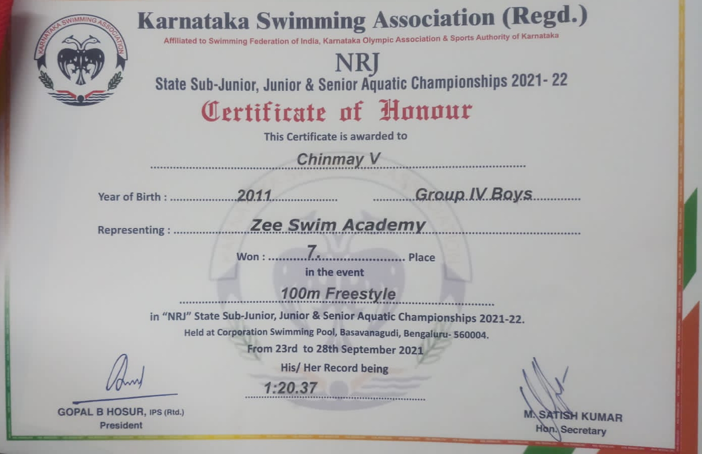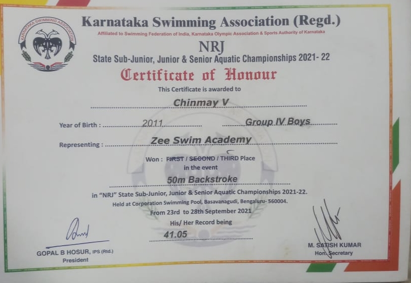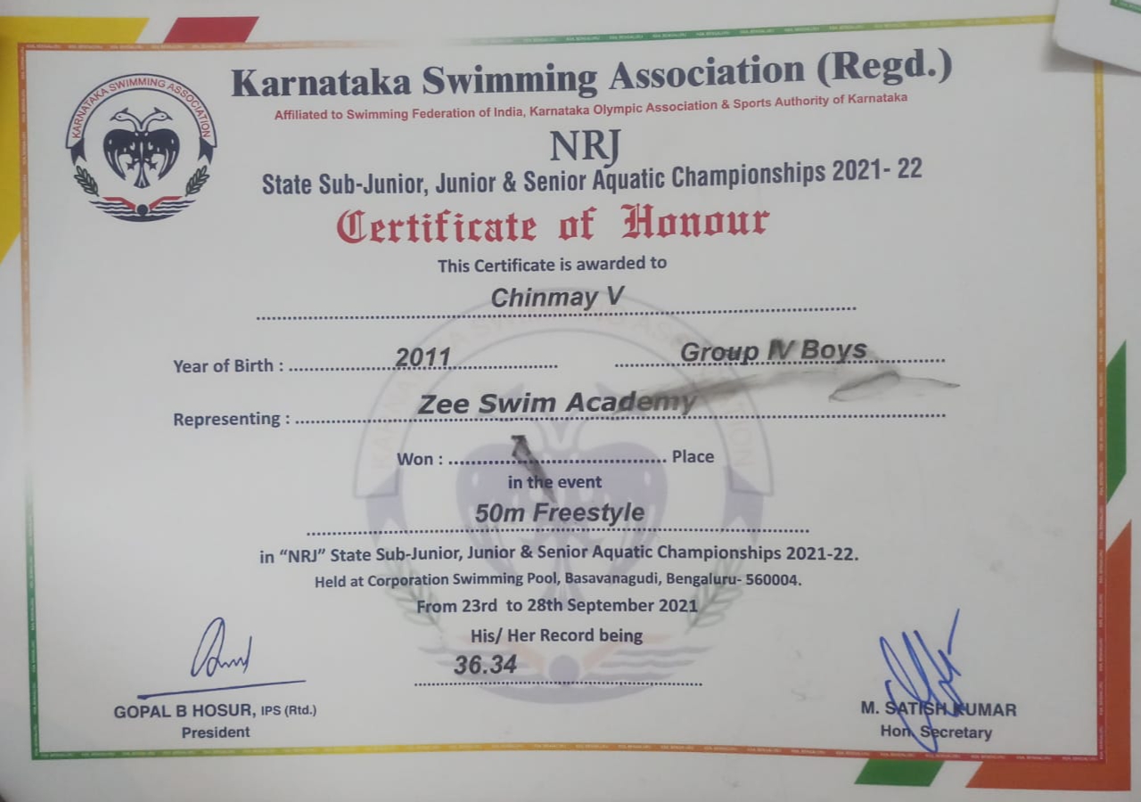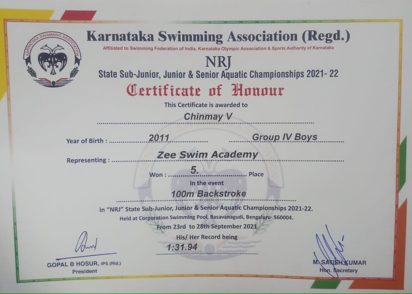 Swimming is an individual or team racing sport that requires the use of one’s entire body to move through water. Competitive swimming is one of the most popular sports with varied distance events in butterfly, backstroke, breaststroke, freestyle, and individual medley. NRJ has organized state level sub junior, junior and senior aquatic championship 2021-22 from 23rd to 28th September, 2021 at corporation swimming pool, Basavanagudi, Bengaluru.