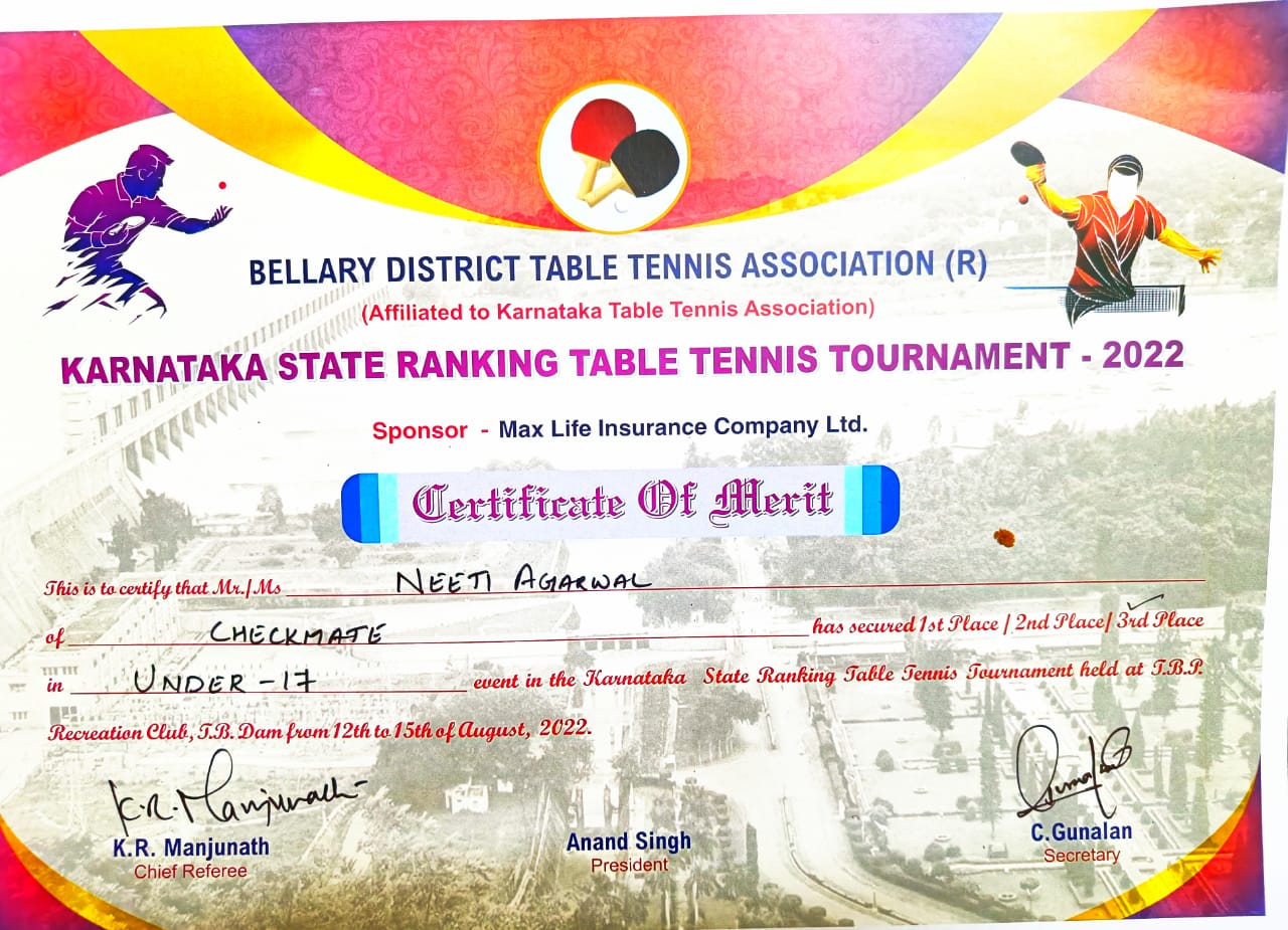 VYEDEHI SCHOOL OF EXCELLENCE is proud to announce that NEETI AGRAWAL won STATE RANKING TABLE TENNIS TOURNAMENT in Hospet in U15 CATEGORY. She played very aggressive games & did not lose a single set in U15 & retained her number 1 ranking in state. SHE ALSO PLAYED EXCEEDINGLY WELL & REACHED SEMI-FINAL IN U17 & QUARTER FINAL IN U19.
