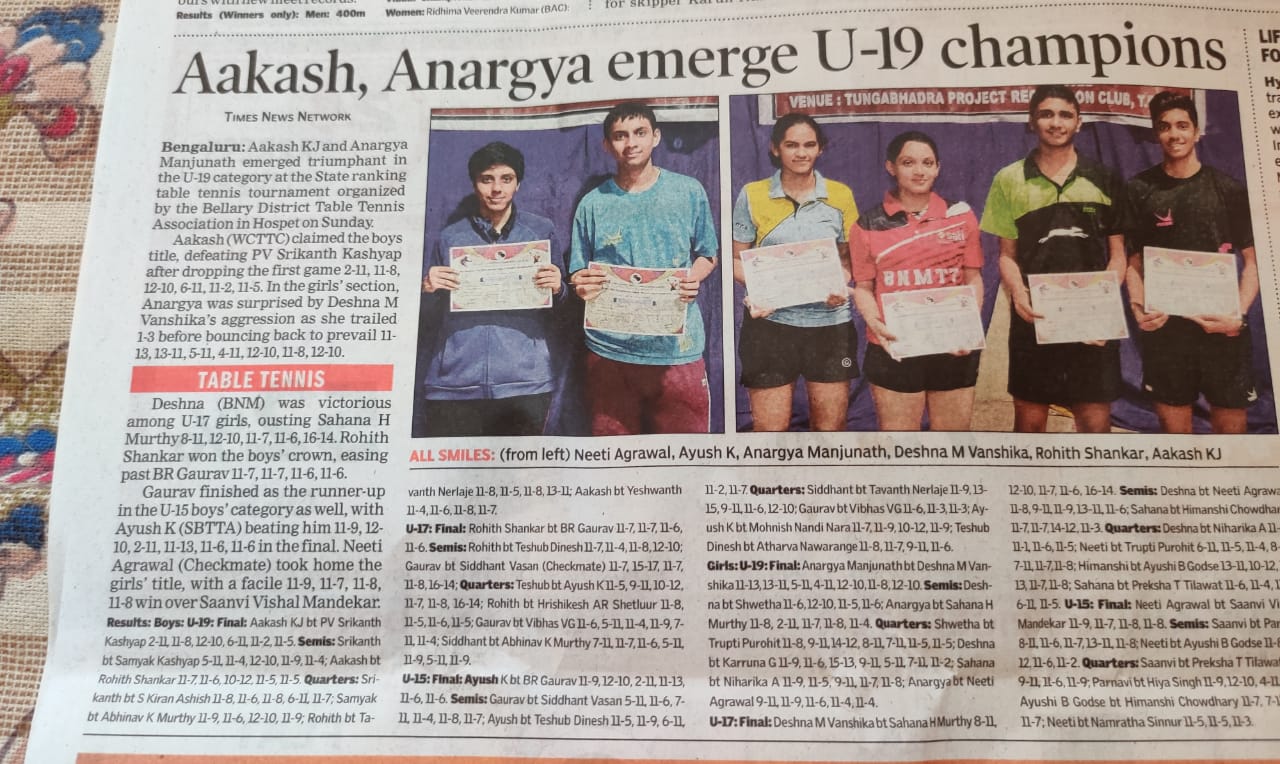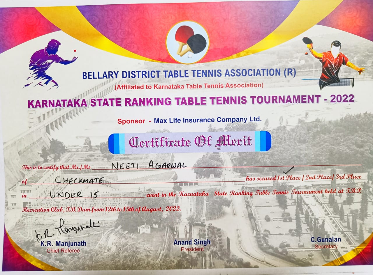 VYEDEHI SCHOOL OF EXCELLENCE is proud to announce that NEETI AGRAWAL won STATE RANKING TABLE TENNIS TOURNAMENT in Hospet in U15 CATEGORY. She played very aggressive games & did not lose a single set in U15 & retained her number 1 ranking in state. SHE ALSO PLAYED EXCEEDINGLY WELL & REACHED SEMI-FINAL IN U17 & QUARTER FINAL IN U19.
