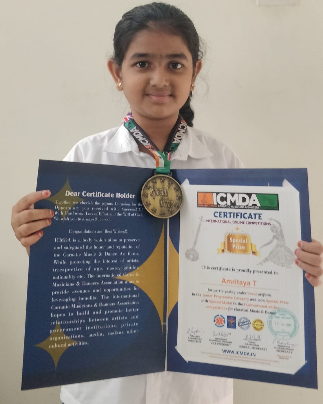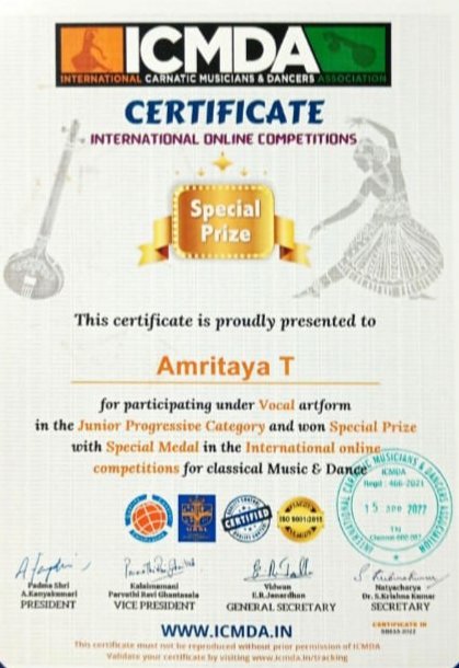 VYDEHI SCHOOL OF EXCELLENCE is feeling extremely proud to announce that Amritaya T of grade 6F has won a certificate and a medal from ICMDA, an INTERNATIONAL CARNATIC COMPETITION, and has also achieved special prize in vocal art form.