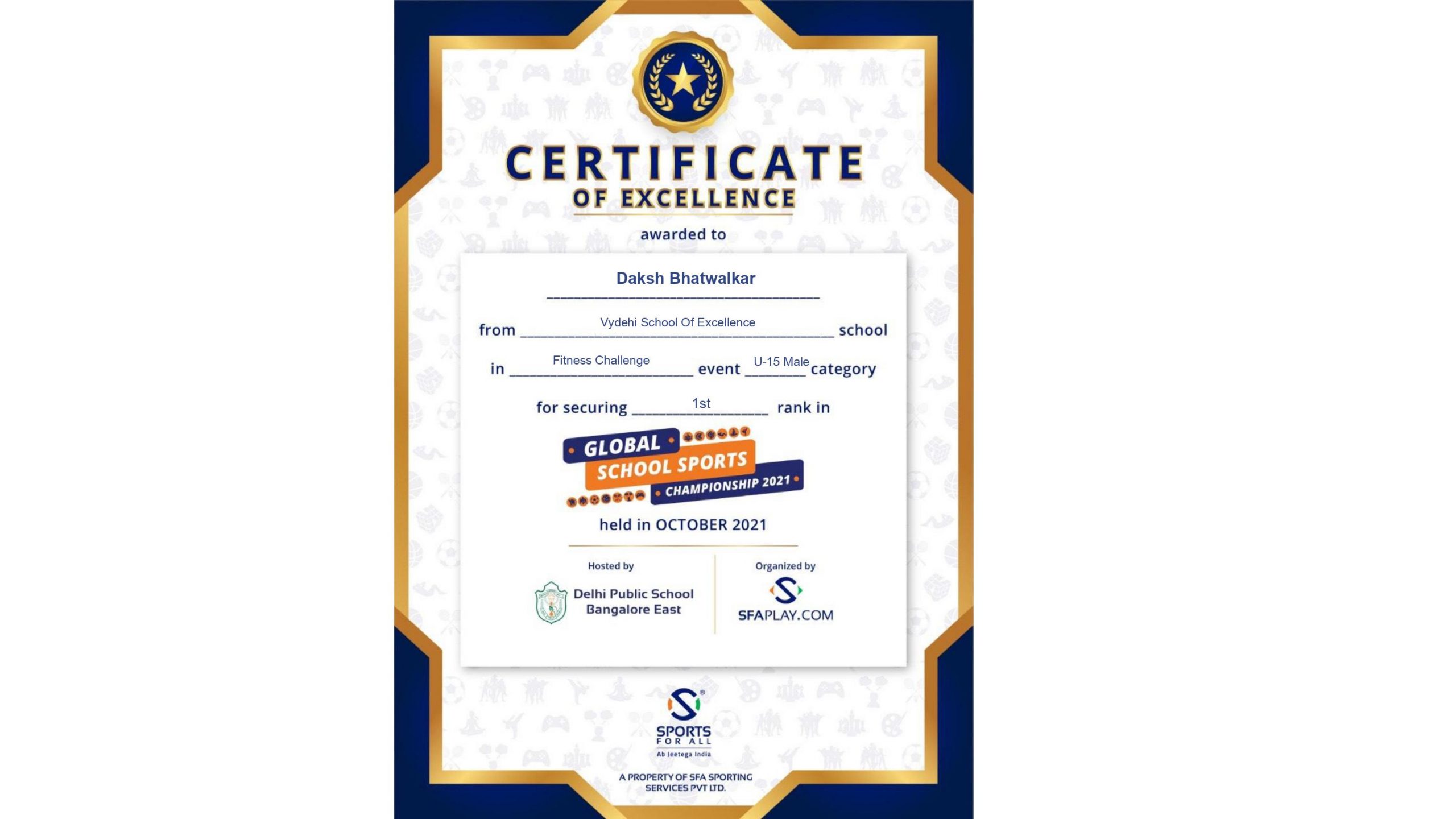 Vydehi School of Excellence is extremely contented to announce that Daksh Bhatwalkar of Grade 6 has been awarded Certificate of Excellence in Fitness Challengeevent U-15 Malecategory for securing 1st rank in GLOBAL SCHOOL SPORTS CHAMPIONSHIP 2021 held in October’ 21 organized by SFAPLAY.com.