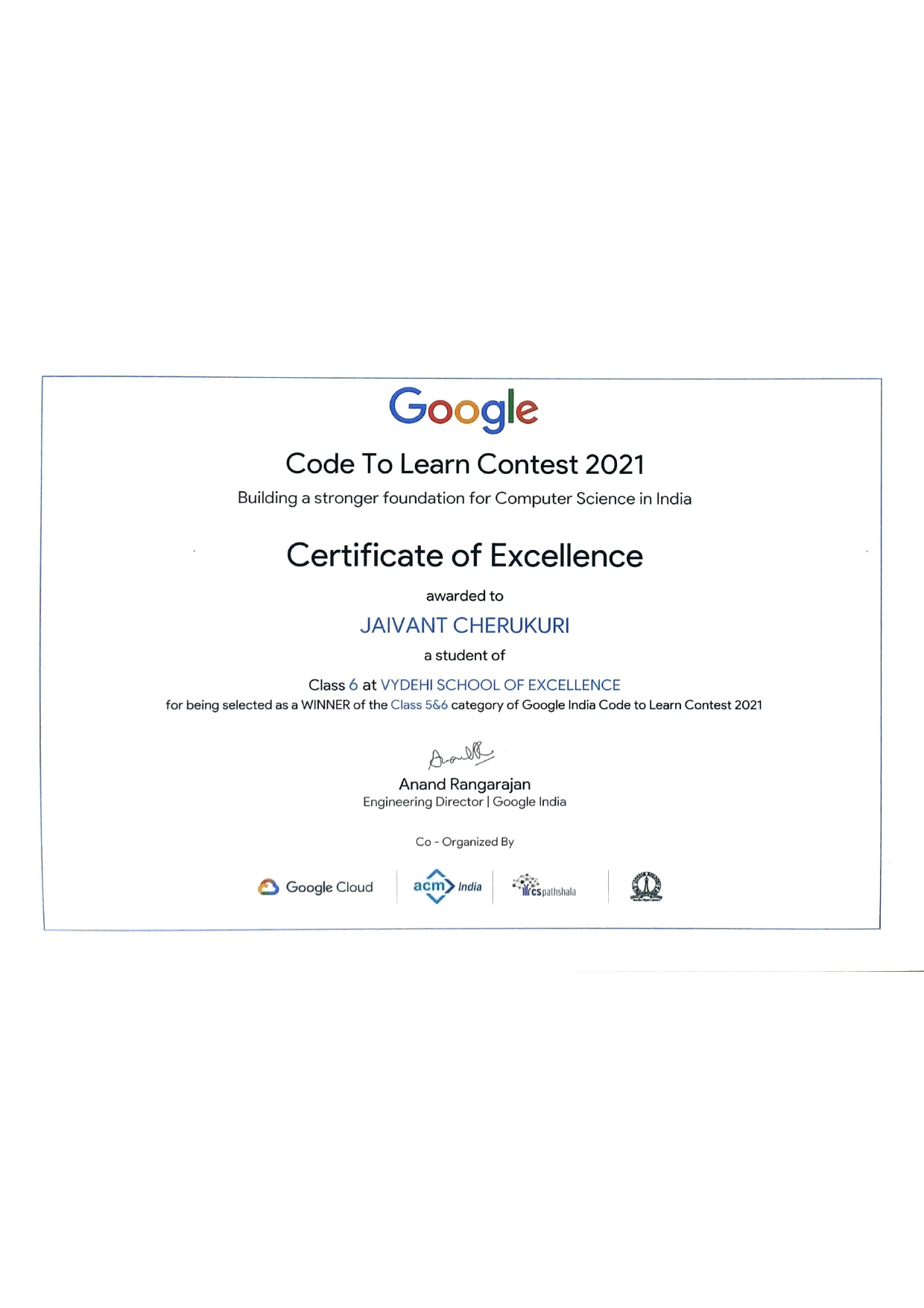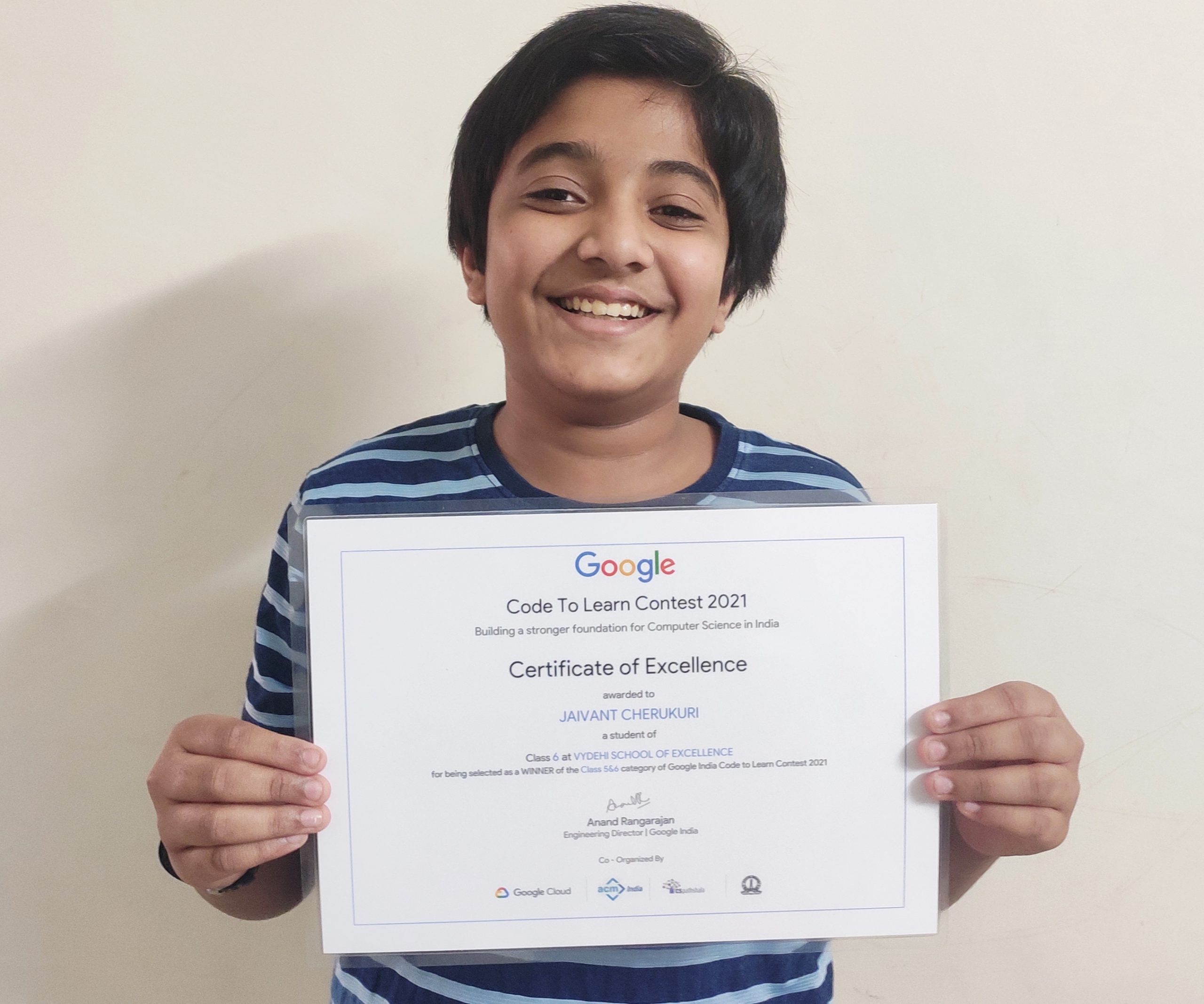 We are very proud to share the achievement of Jaivant of Grade 6 of Vydehi School of Excellence, has developed a game depicting ‘a volunteer collecting excess food from donors and sharing it with the needy’ using MIT Scratch. The indentation of the game is to educate on not wasting food in first place and donate food to needy in case of excess. Jaivant received Certificate of Achievement and a Chromebook Laptop with other goodies.