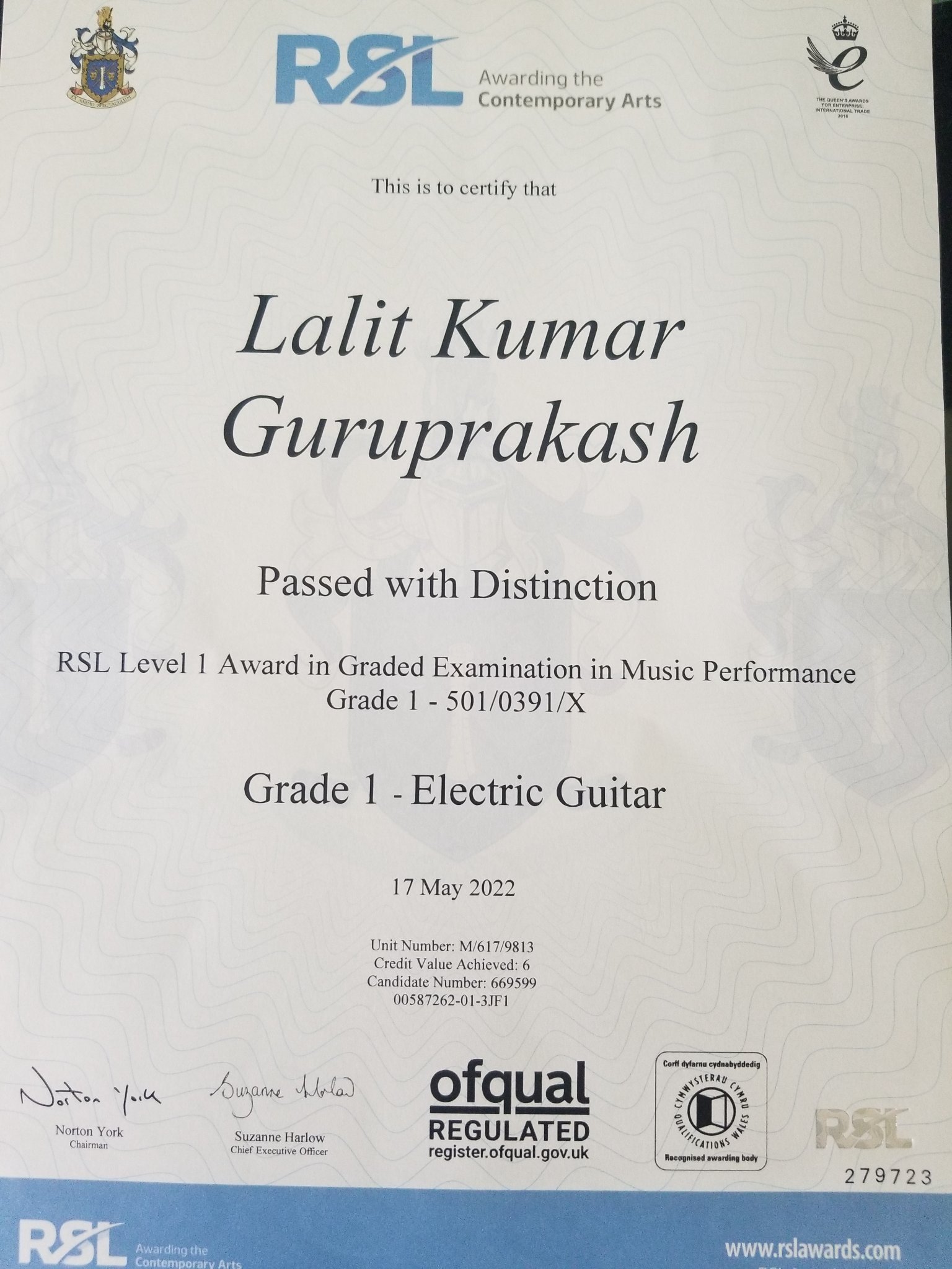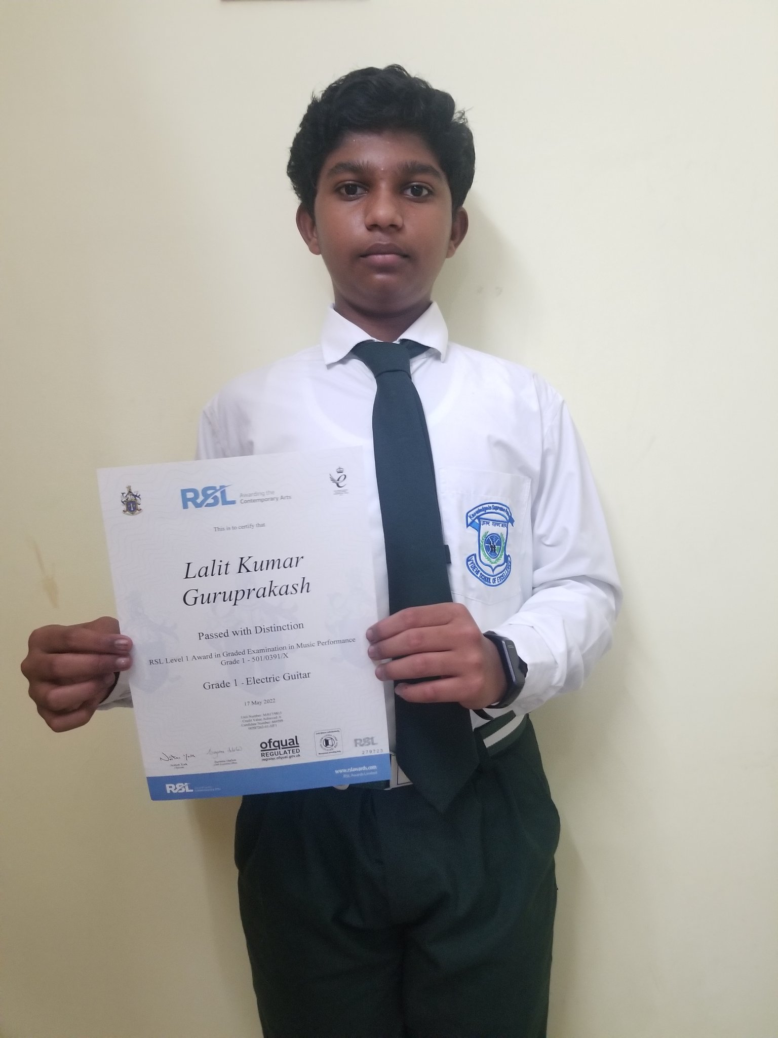 Vydehi School of Excellence is proud to announce that Lalit Kumar Guruprakash of Grade 8 has passed with distinction the RSL Level 1 Award in Graded Examination in Music Performance in Electric Guitar under RSL Awards – Grade 1 – Performance Certificate. Candidates can choose to play all five pieces from the repertoire from the Rock school, RSL Classical Graded Book or choose to record up to three free choice pieces from their own composition.