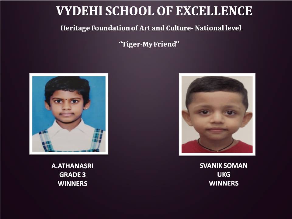 Vydehi School of Excellence is exhilaratingly happy to announce the winners for the nation-wide Colouring competition held by Heritage Foundation of Art and Culture on their 6th edition of “Tiger – My Friend”, where the program had 2 activities: story-telling and coloring competition which was aged from Nursery to Grade 3. The performances were evaluated under their respective grades and were held online from 25th July to 8th August 2021. The event had the participation of students from 110 schools and 38 cities, and we are proud to announce that our students have won the competition. The winners are: