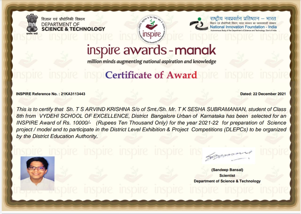 Vydehi School of Excellence is proud to announce that TS Arvind Krishna of Grade 8 is among the Selected Students under the INSPIRE Award Scheme (MANAK) for the Year 2021-22, National Innovation foundation – India under Department of Science & Technology, and he received a cash prize of Rs 10,000.