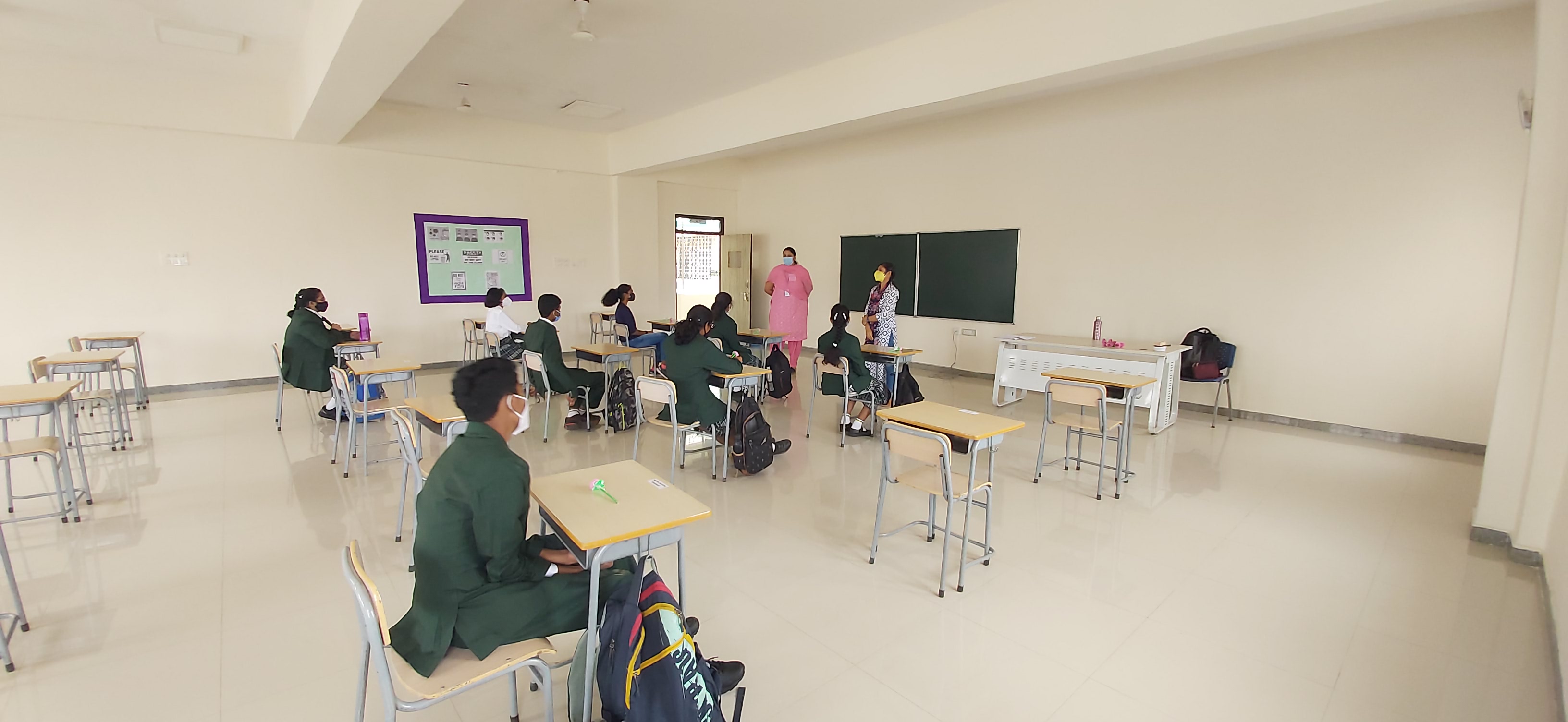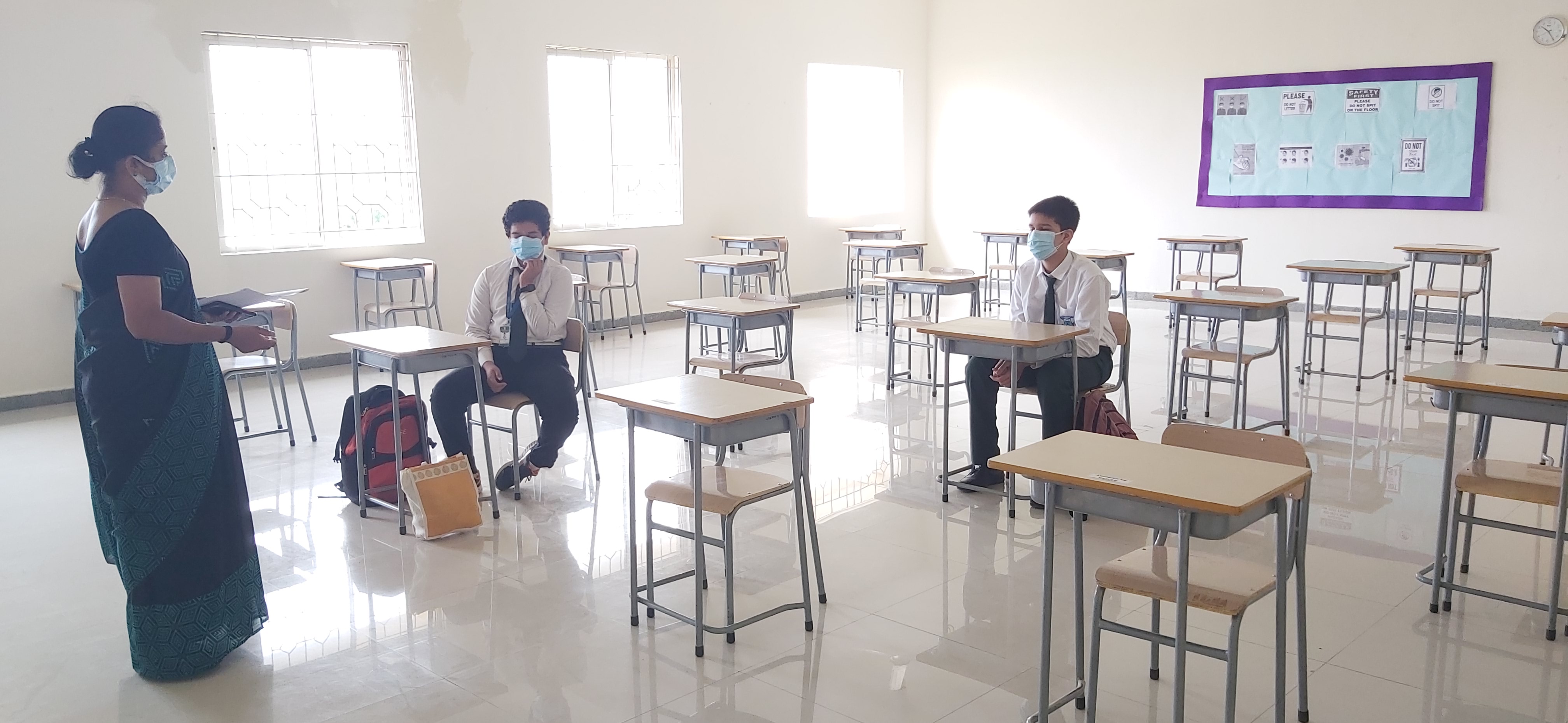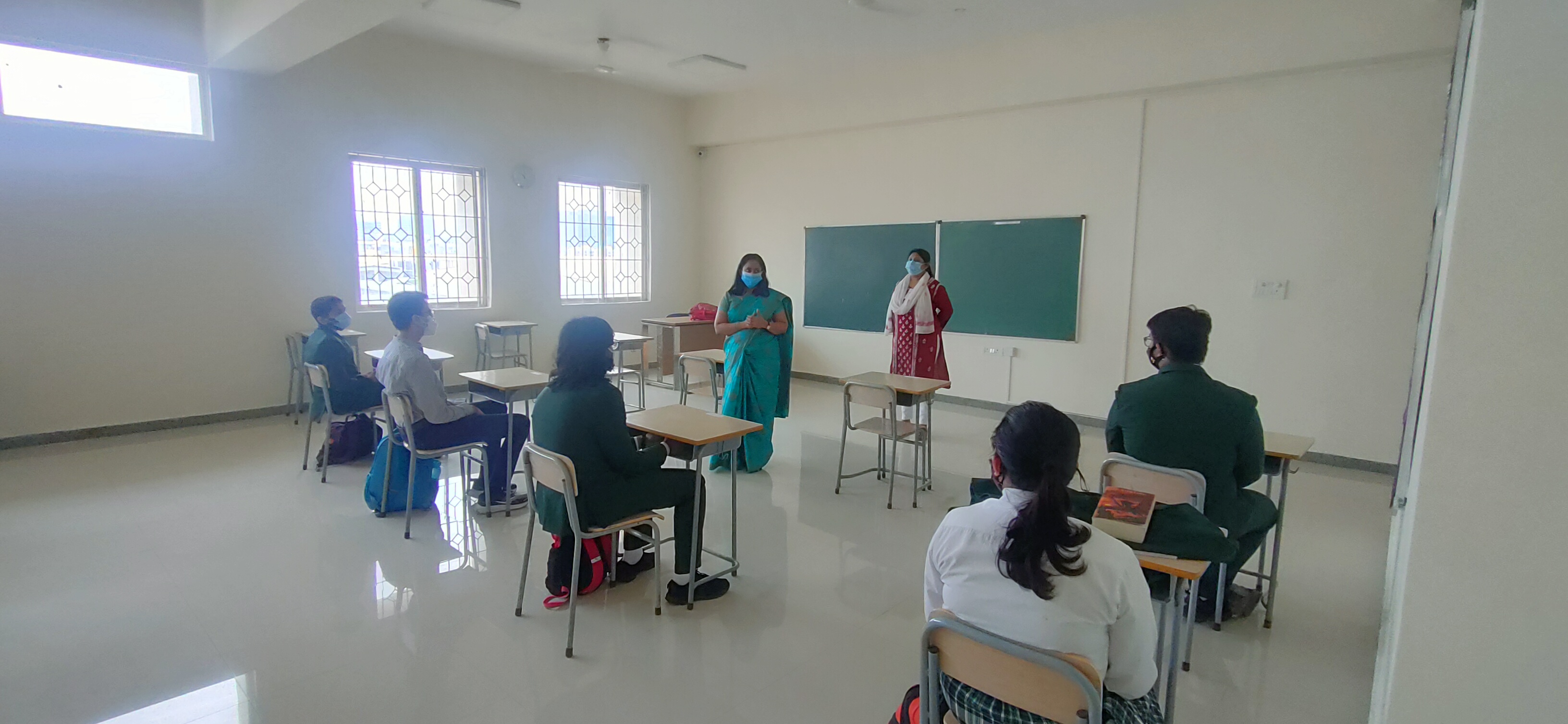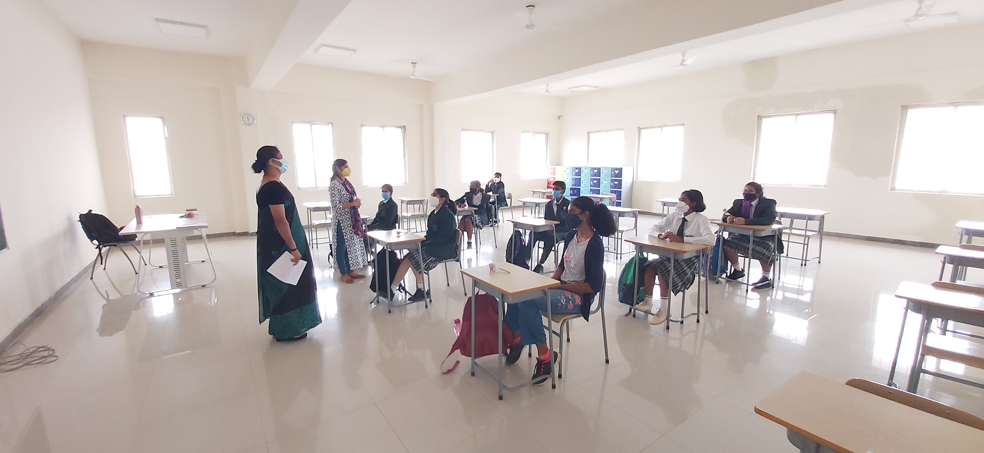 We, at Vydehi School of Excellence welcomed our Grade 9&10 students back to a traditional face to face school after a hiatus of almost 18 months. Though the numbers were less, the spirits were high. The day was planned for the acclimatization of the students to break the online routine. Interactive sessions by the Principal, Vice Principal and Counselor made the students comfortable. They were briefed upon the SOPs and the importance of adherence to COVID protocols. Teachers by passed the normal route of teaching and conducted activities on “Swachhata” stressing on the importance of social distancing and other safety guidelines.