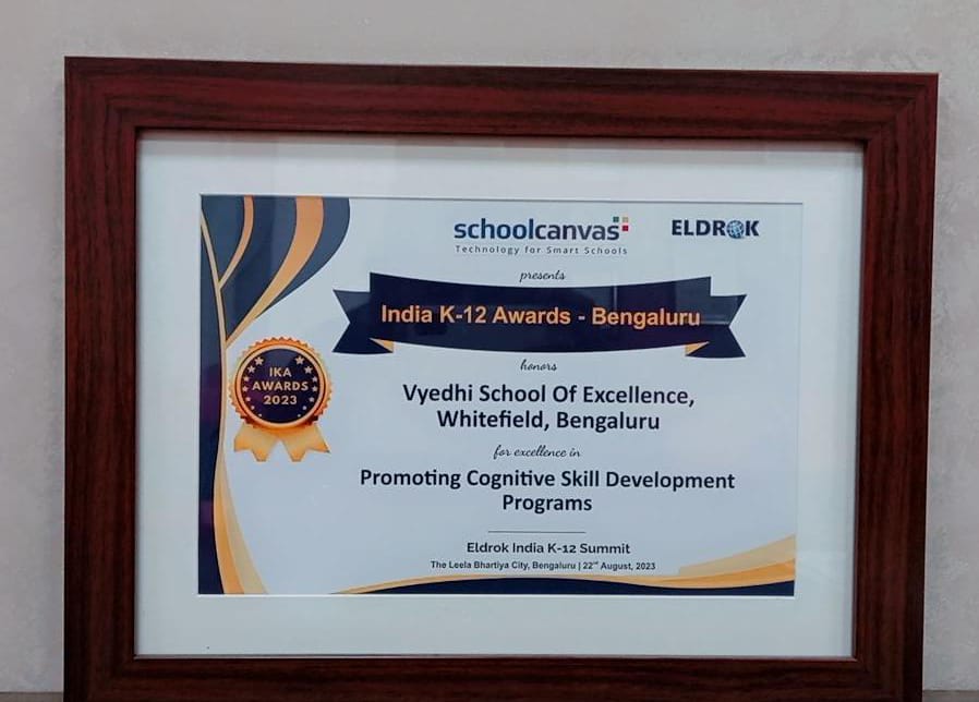 Vydehi School of Excellence soars to new heights- a symphony of success in K-12 education. We are immensely proud that our school has been honoured India K-12 award for excellence in promoting cognitive skill development programs. This award is a crescendo celebrating the dedication, creativity, and collaborative spirit that make our school a vibrant tapestry of learning.