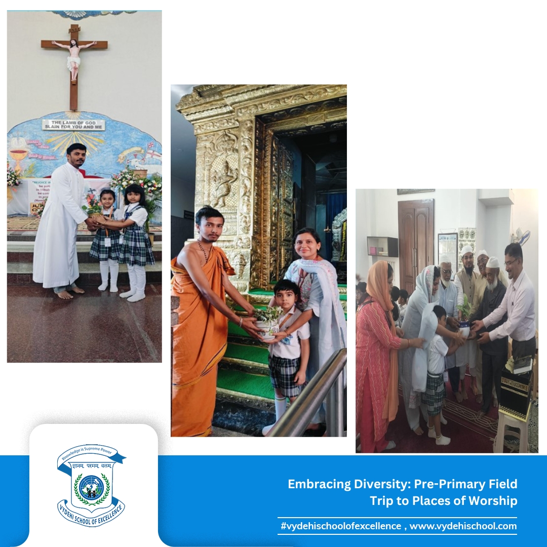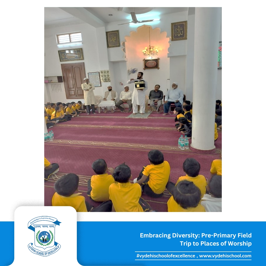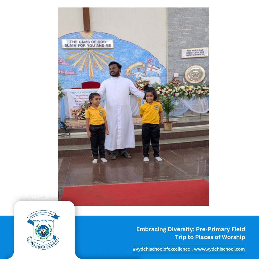 “Vydehi School of Excellence organised an insightful field trip for our Pre-Primary students on the 12th and 13th of February 2025, exploring the beauty of different faiths at a temple, church, and mosque in Whitefield. This immersive experience allowed our little learners to appreciate diverse cultures, architectural styles, and religious practices, fostering values of respect, harmony, and inclusivity.