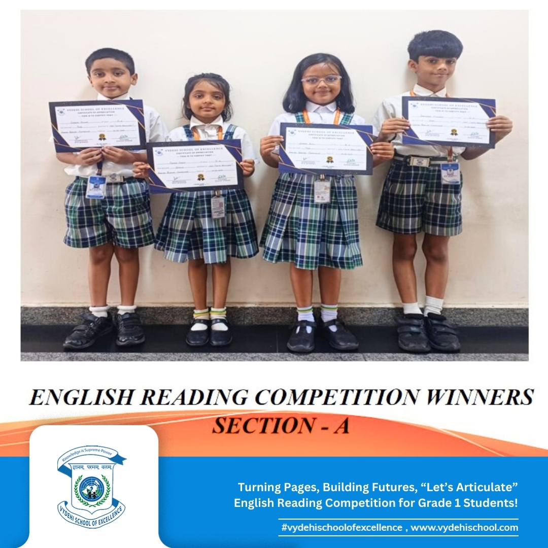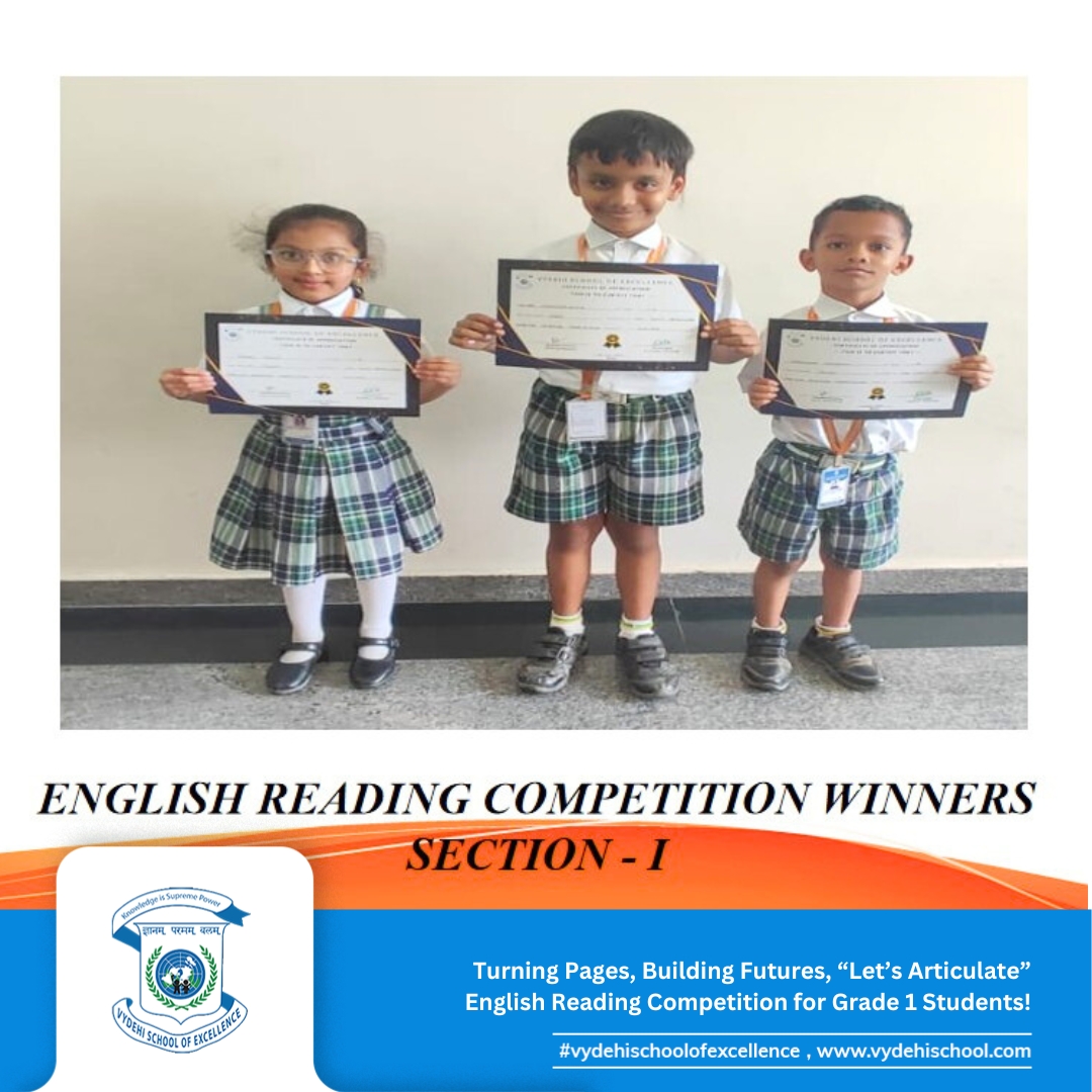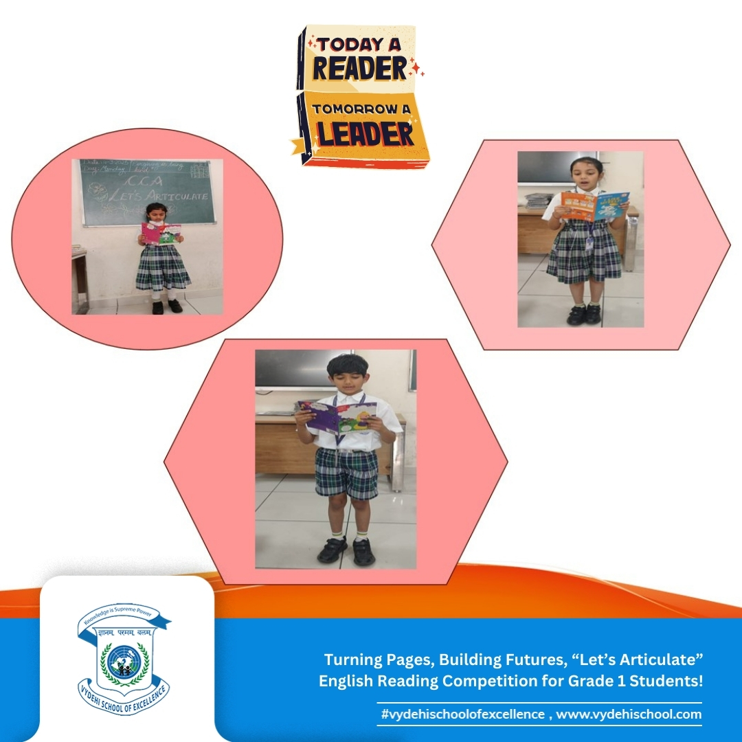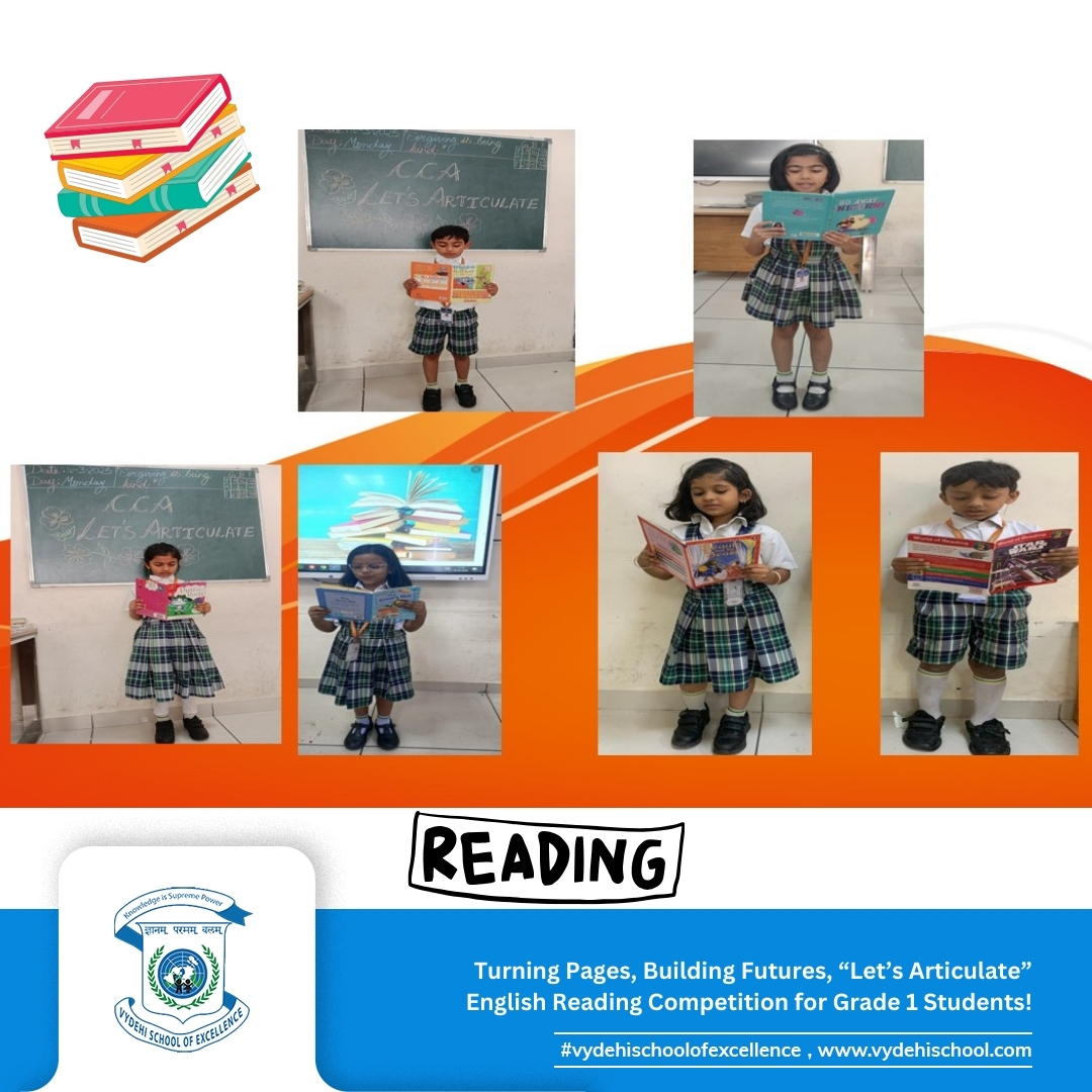 Vydehi School of Excellence proudly hosted the CCA event βLetβs Articulateβ, an English reading competition for Grade 1 students. Our young bookworms stepped into the spotlight, confidently showcasing their fluency, pronunciation, and expression! π€π