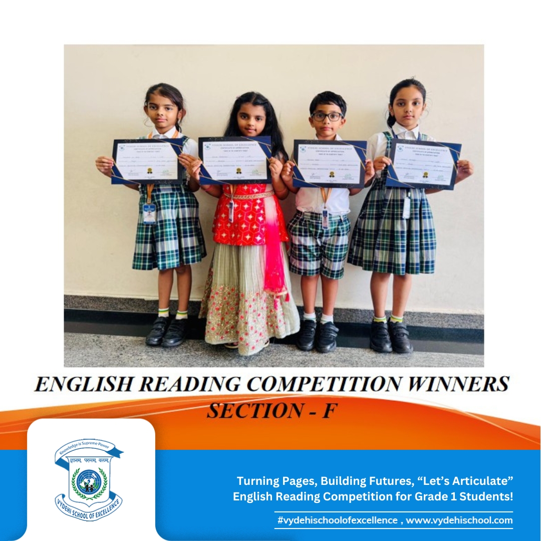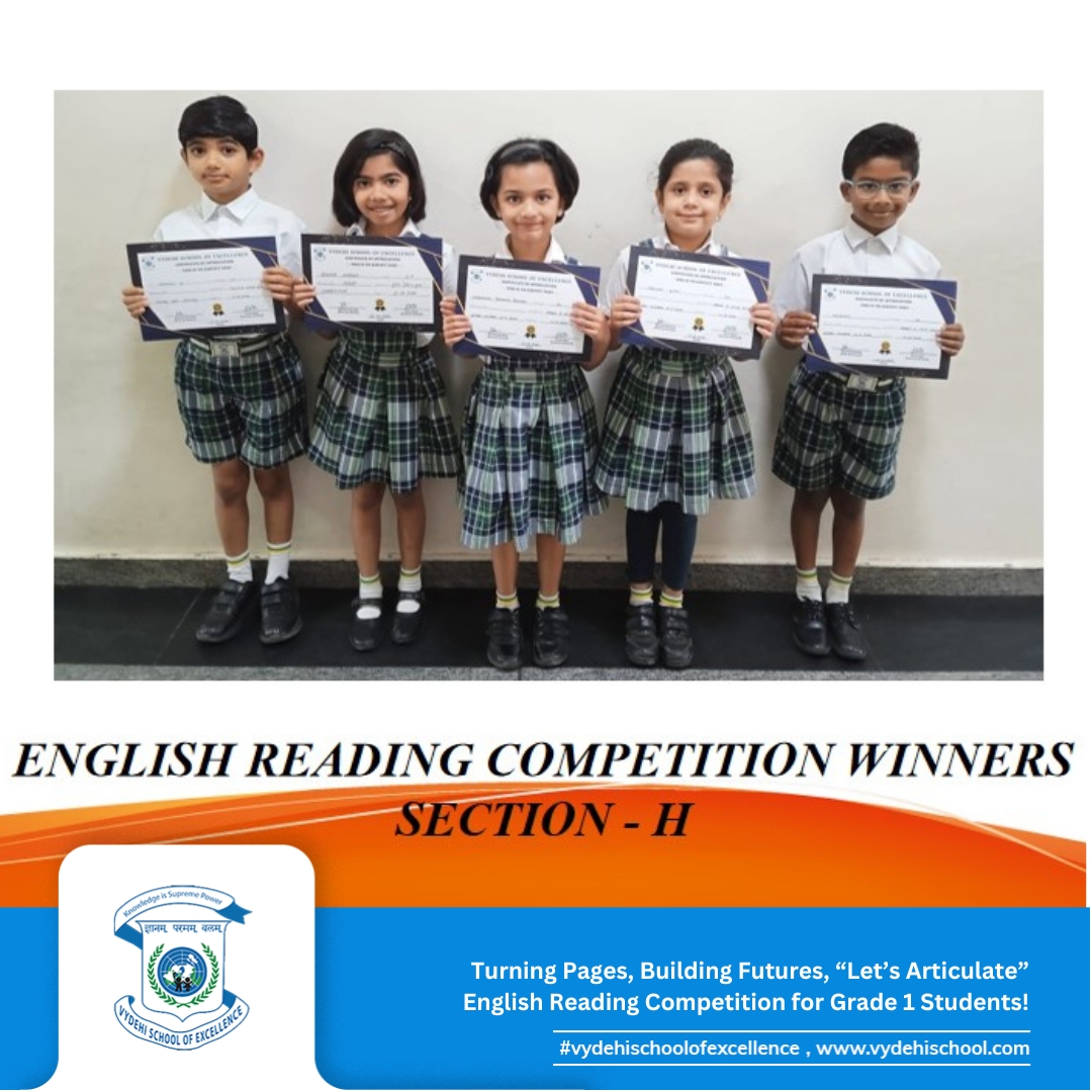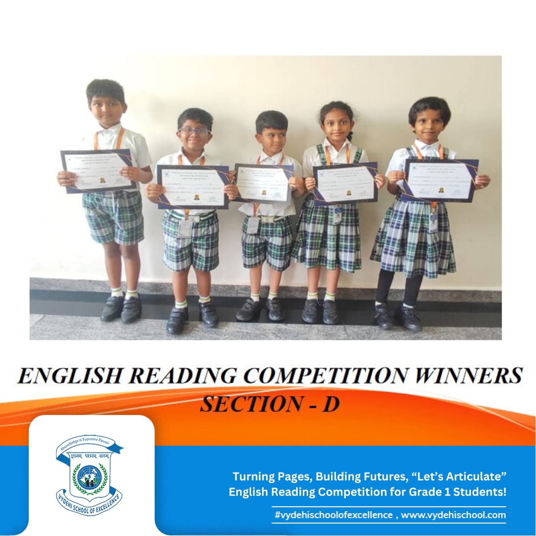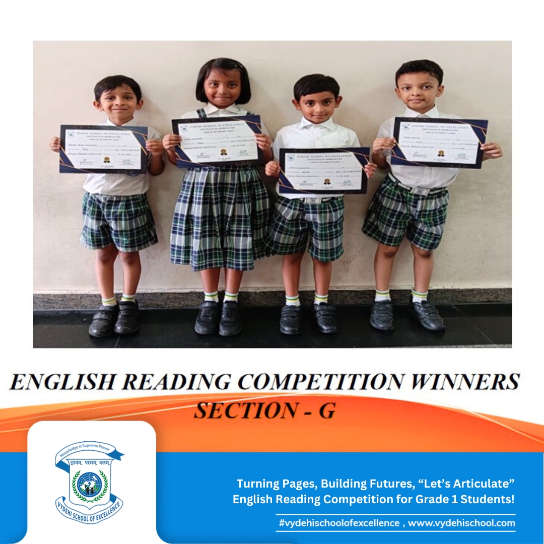 Vydehi School of Excellence proudly hosted the CCA event βLetβs Articulateβ, an English reading competition for Grade 1 students. Our young bookworms stepped into the spotlight, confidently showcasing their fluency, pronunciation, and expression! π€π