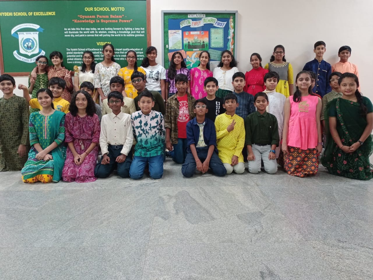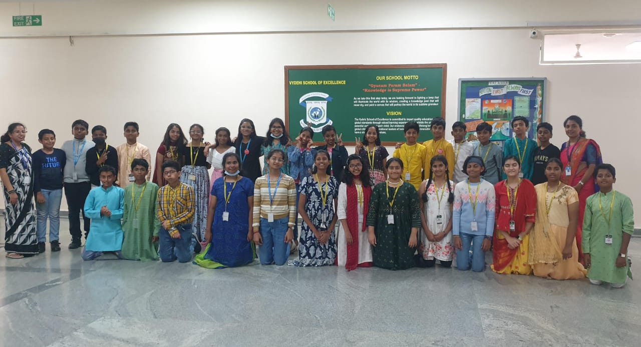 In the era of modernization and westernization when most of the people are moving away from their own culture and history, Vydehi School of Excellence celebrated Ethnic day on 10th November, 2023. It enabled the young generation to revive love and respect for their own culture and history. Little ones were provided with an opportunity to celebrate the diversity of vibrant and colourful India. The whole campus seems to be charged with ethnic atmosphere when a mini-India was created with students in their dazzling, colourful, exquisite traditional apparels. An innate desire of students to dress up, look good and feel great was accomplished through this event.
