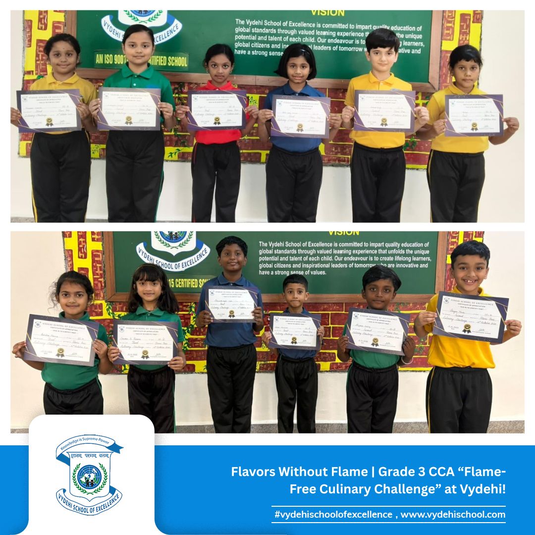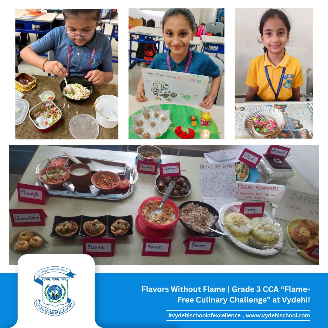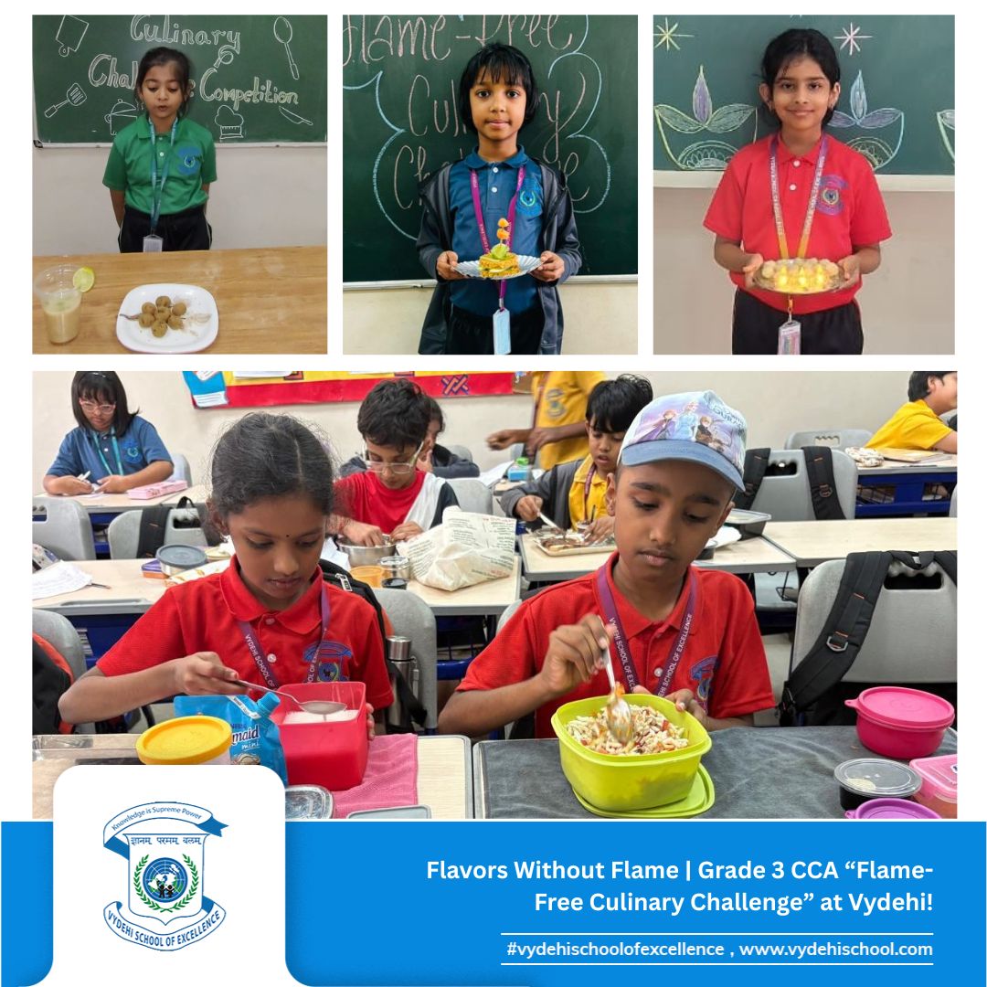 Vydehi School of Excellence stirred up excitement on 15th October 2025 as Grade 3 students participated in the “Flame-Free Culinary Challenge” under the theme “Flavours Without Flame.” 👩‍🍳🧑‍🍳 The competition inspired young Vydehians to prepare delicious traditional festive dishes from their native states — all without using fire!