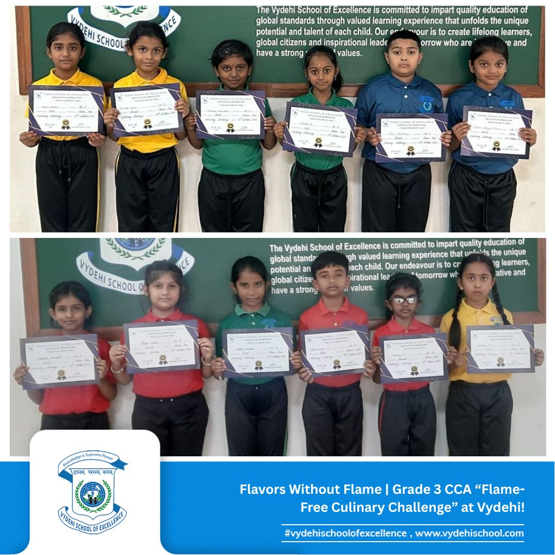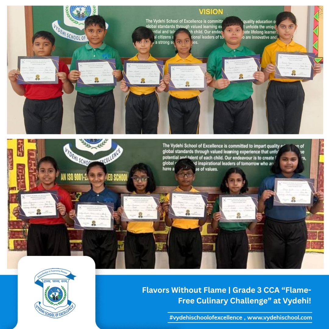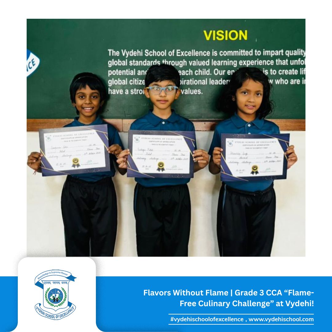 Vydehi School of Excellence stirred up excitement on 15th October 2025 as Grade 3 students participated in the “Flame-Free Culinary Challenge” under the theme “Flavours Without Flame.” 👩‍🍳🧑‍🍳 The competition inspired young Vydehians to prepare delicious traditional festive dishes from their native states — all without using fire!