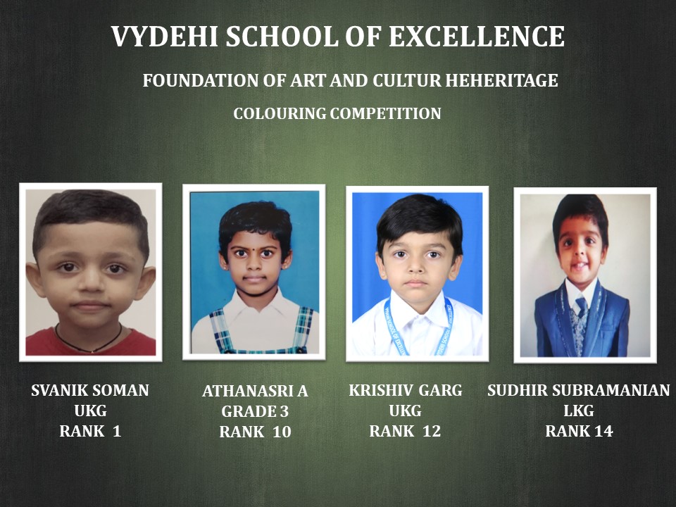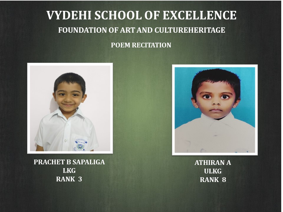 Poetry allows playing with language and sentence structure. Wordplay, rhythm and vocabulary are wonderful poetic features. This creativity, teaches children to experiment with language and to find new ways to communicate. Coloring helps children develop good finger grip. Coloring requires good concentration and this type of focusing on one task can help a child develop his or her overall concentration levels. In order to give young children every opportunity to gain self-confidence and a sense of self-worth, Vydehi School of Excellence organized ‘SPRING BLOSSOMS’ a National Level Inter-School Poem Recitation and Coloring Competition conducted by the Heritage Foundation of Art and Culture. Our students from Pre-primary till Grade 3 have participated and won the prizes.