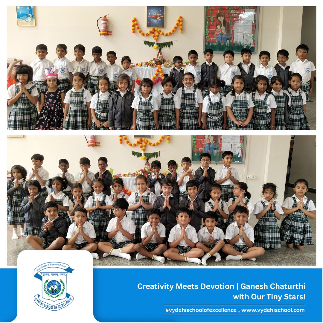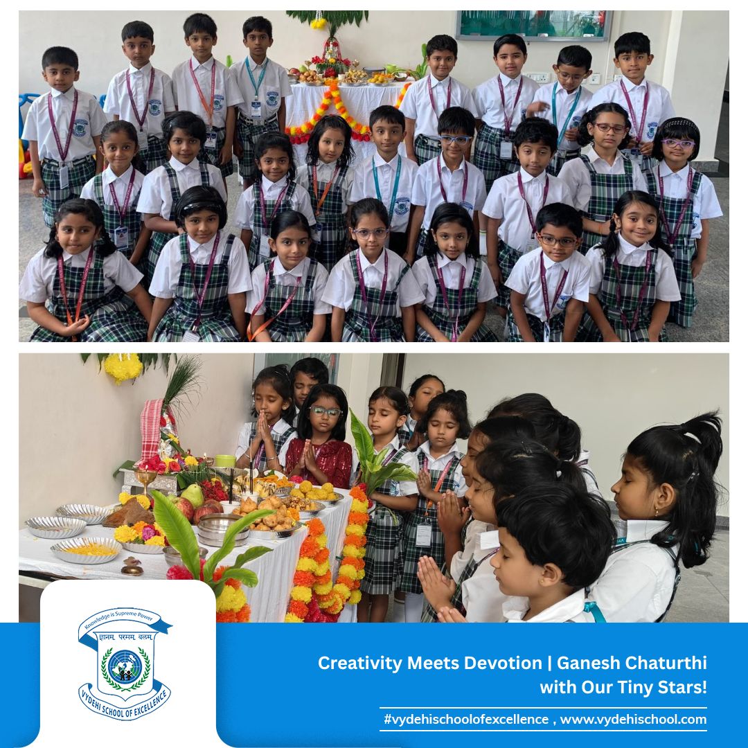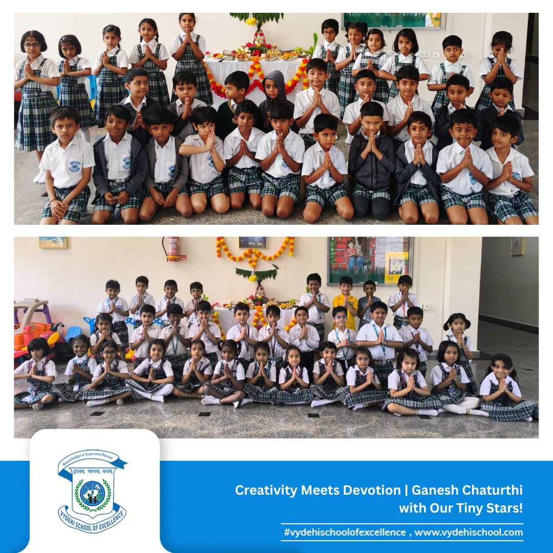 Vydehi School of Excellence joyfully celebrated Ganesh Chaturthi with our Pre-Primary and Grade 1 students on 26th August 2025. The day began with a storytelling session about the birth of Lord Ganesha, helping our little ones understand the cultural and spiritual essence of this auspicious festival. π
