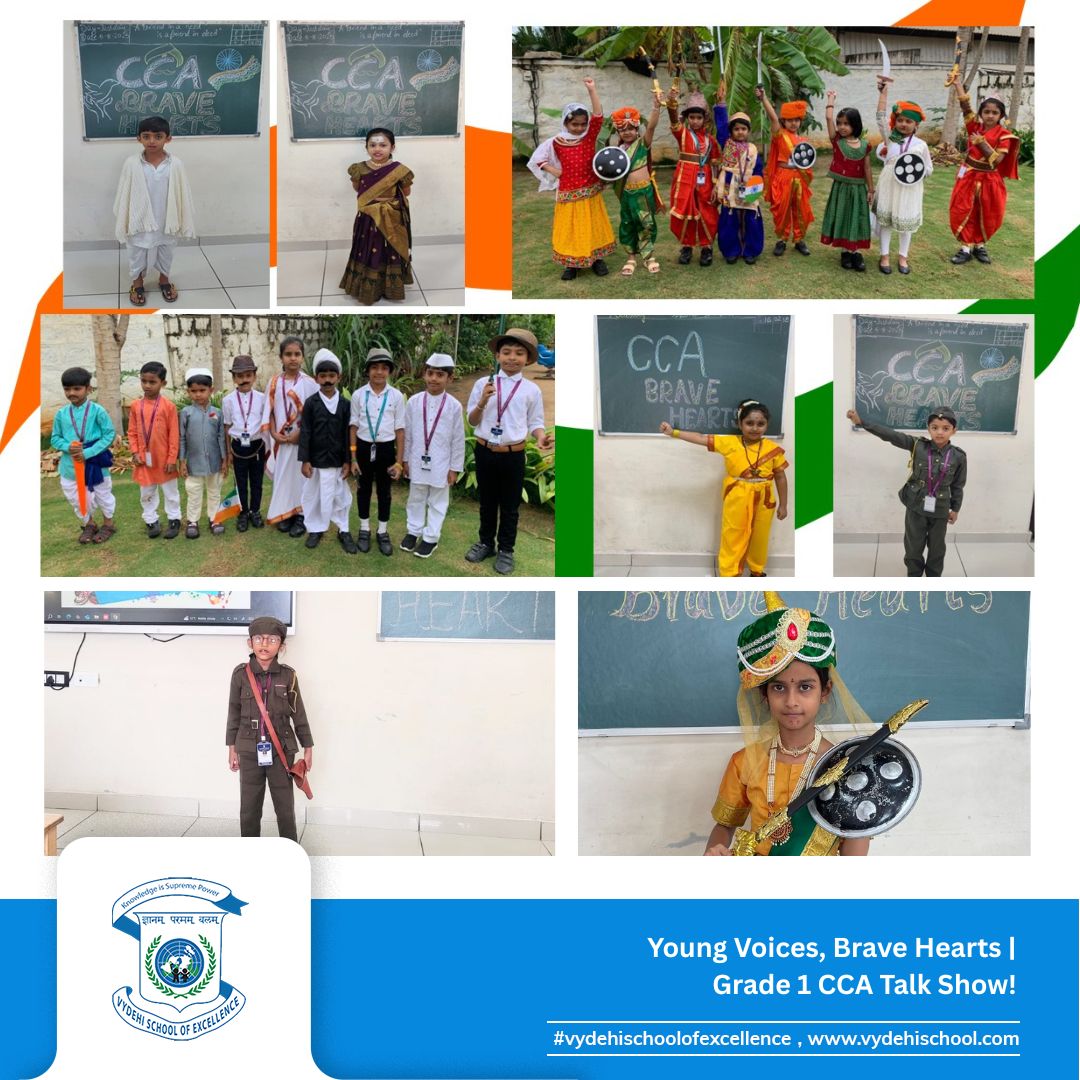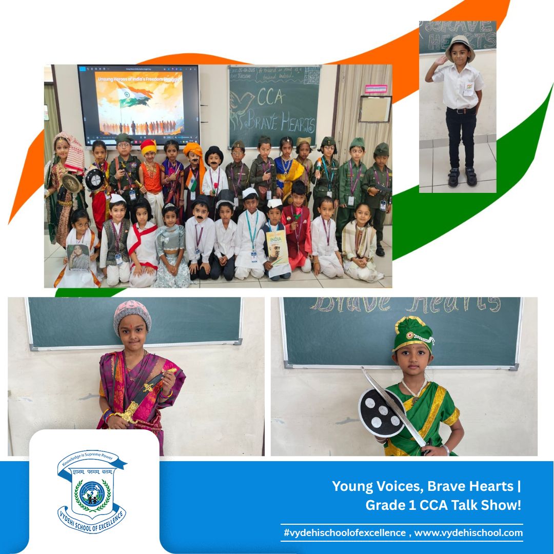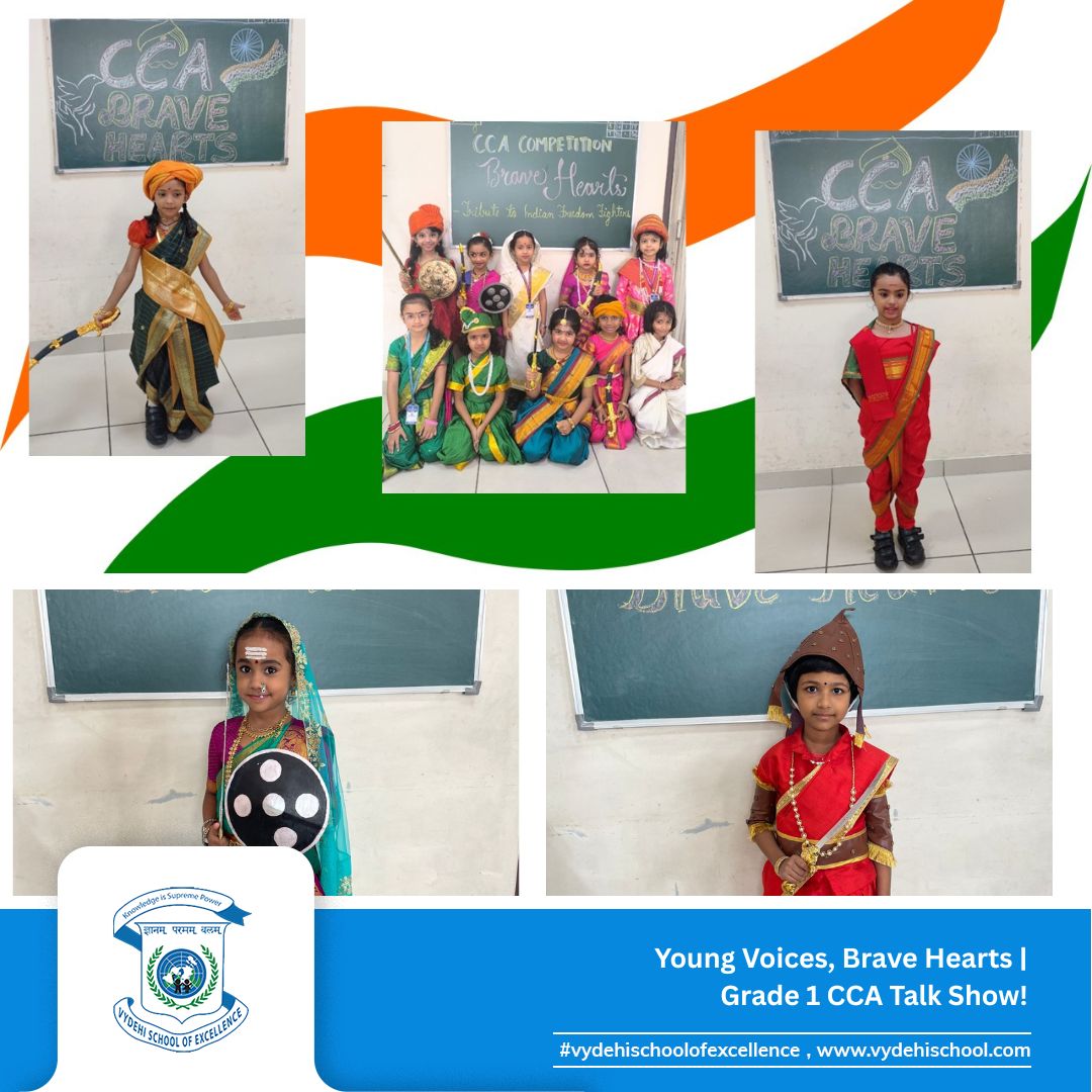 To honour the indomitable spirit of India’s freedom fighters, Vydehi School of Excellence hosted the Grade 1 CCA Competition – “Brave Hearts: A Talk Show”. 🌟 Our little patriots took the stage dressed as Mahatma Gandhi, Rani Lakshmi Bai, Bhagat Singh, Subhas Chandra Bose, and many more legendary heroes.