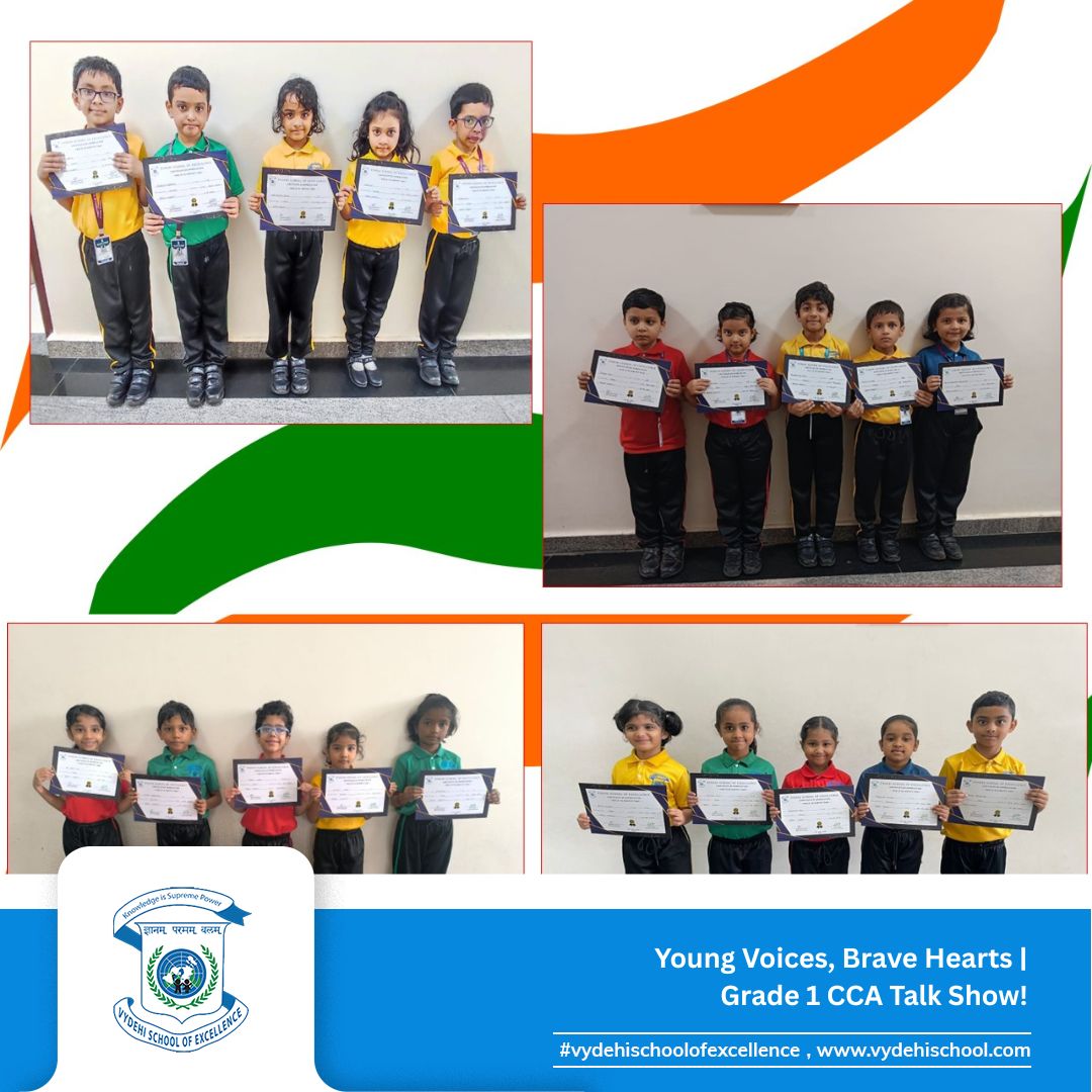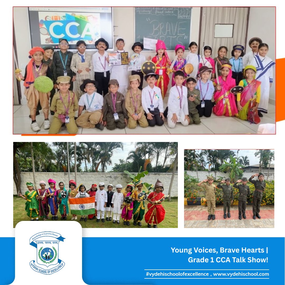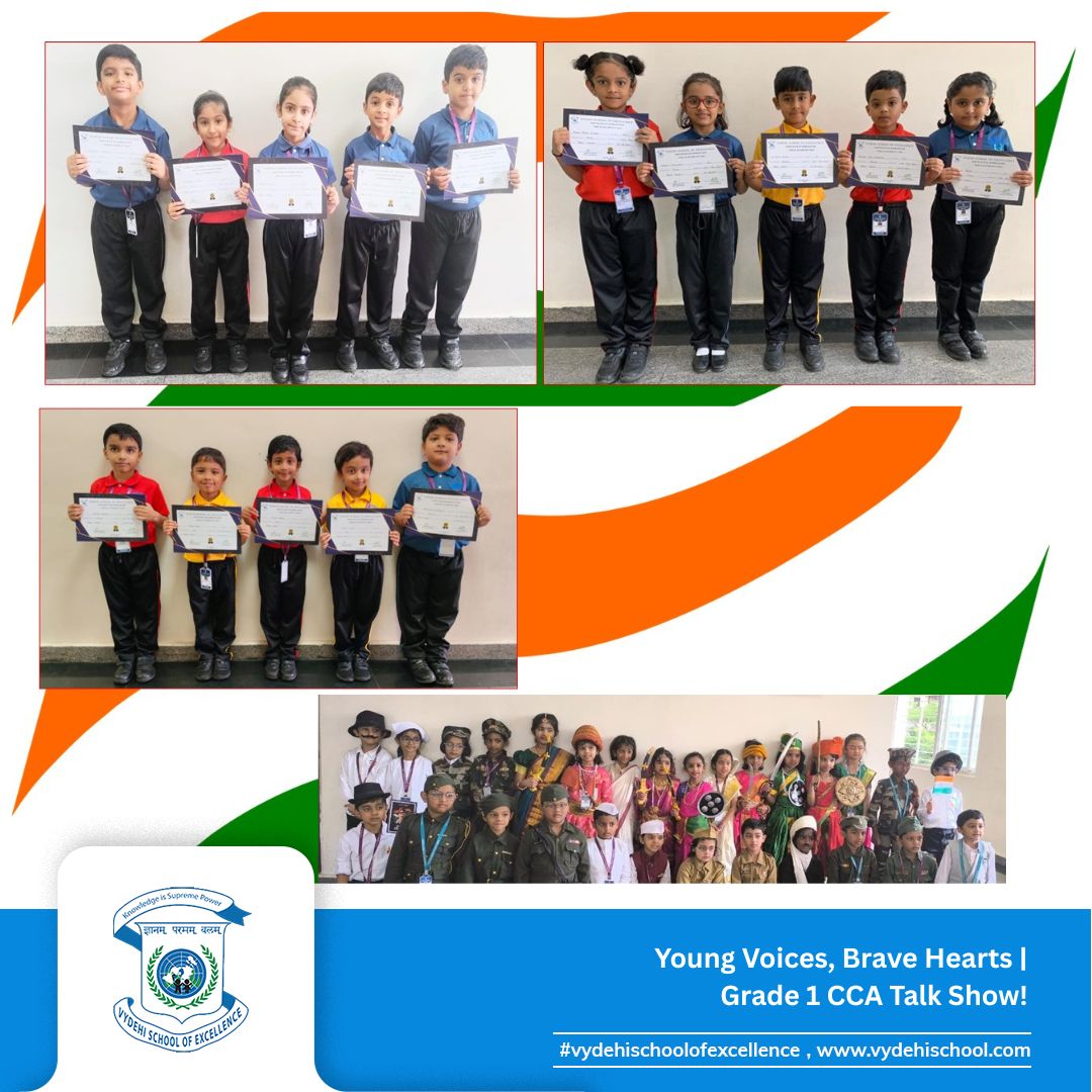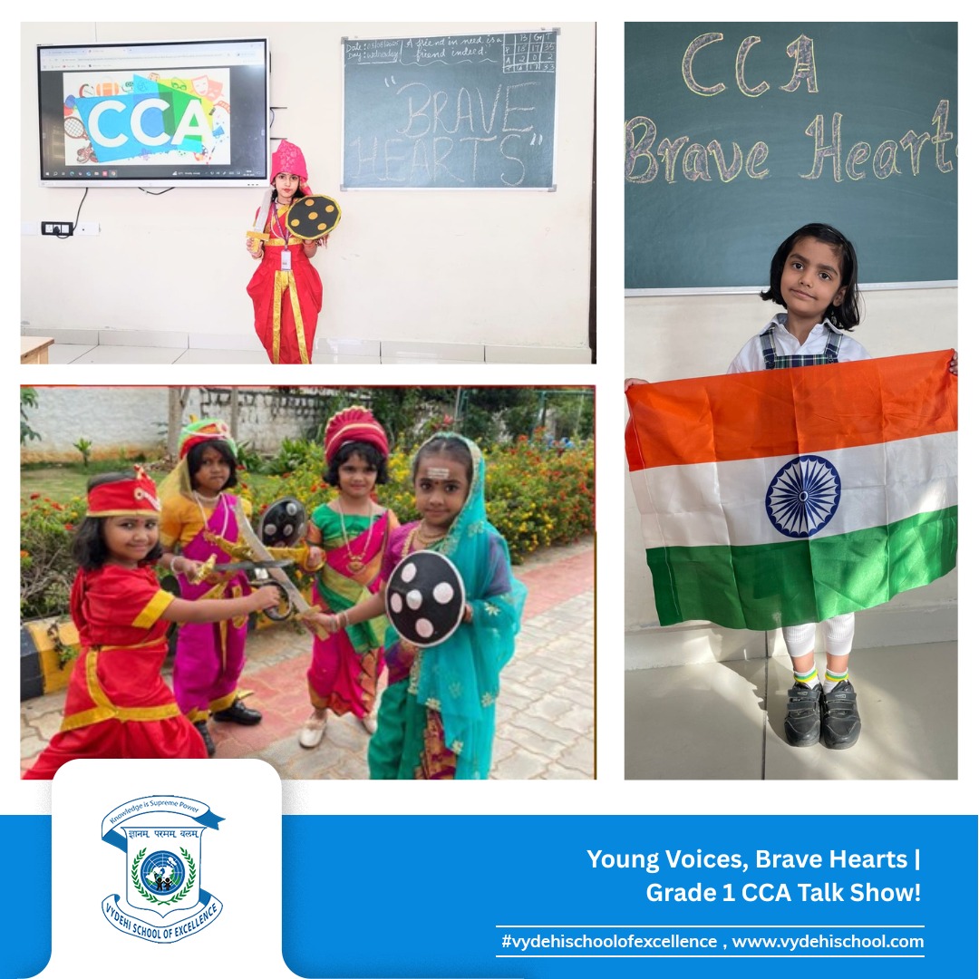 To honour the indomitable spirit of India’s freedom fighters, Vydehi School of Excellence hosted the Grade 1 CCA Competition – “Brave Hearts: A Talk Show”. 🌟 Our little patriots took the stage dressed as Mahatma Gandhi, Rani Lakshmi Bai, Bhagat Singh, Subhas Chandra Bose, and many more legendary heroes.