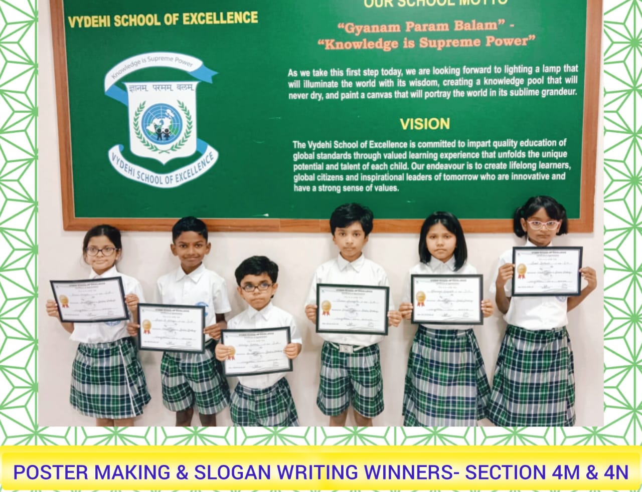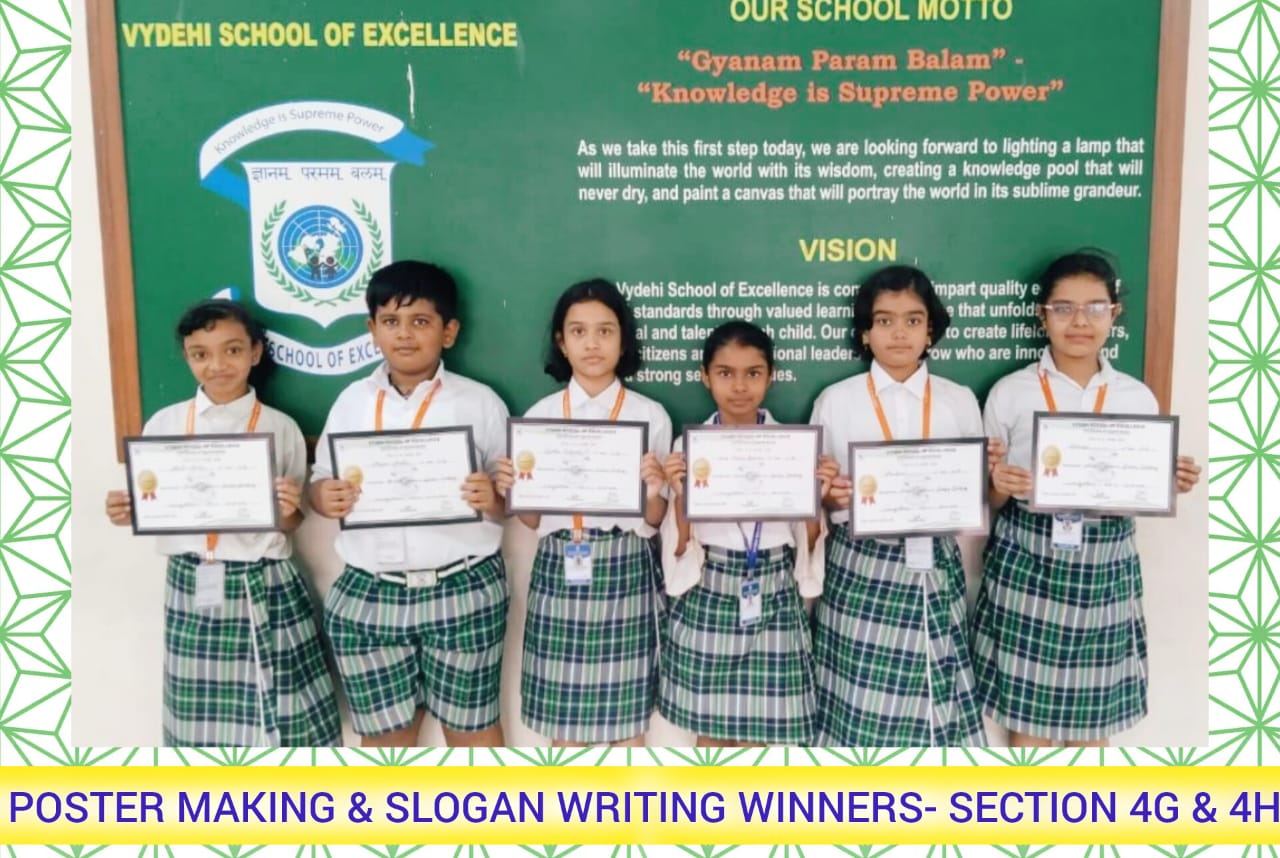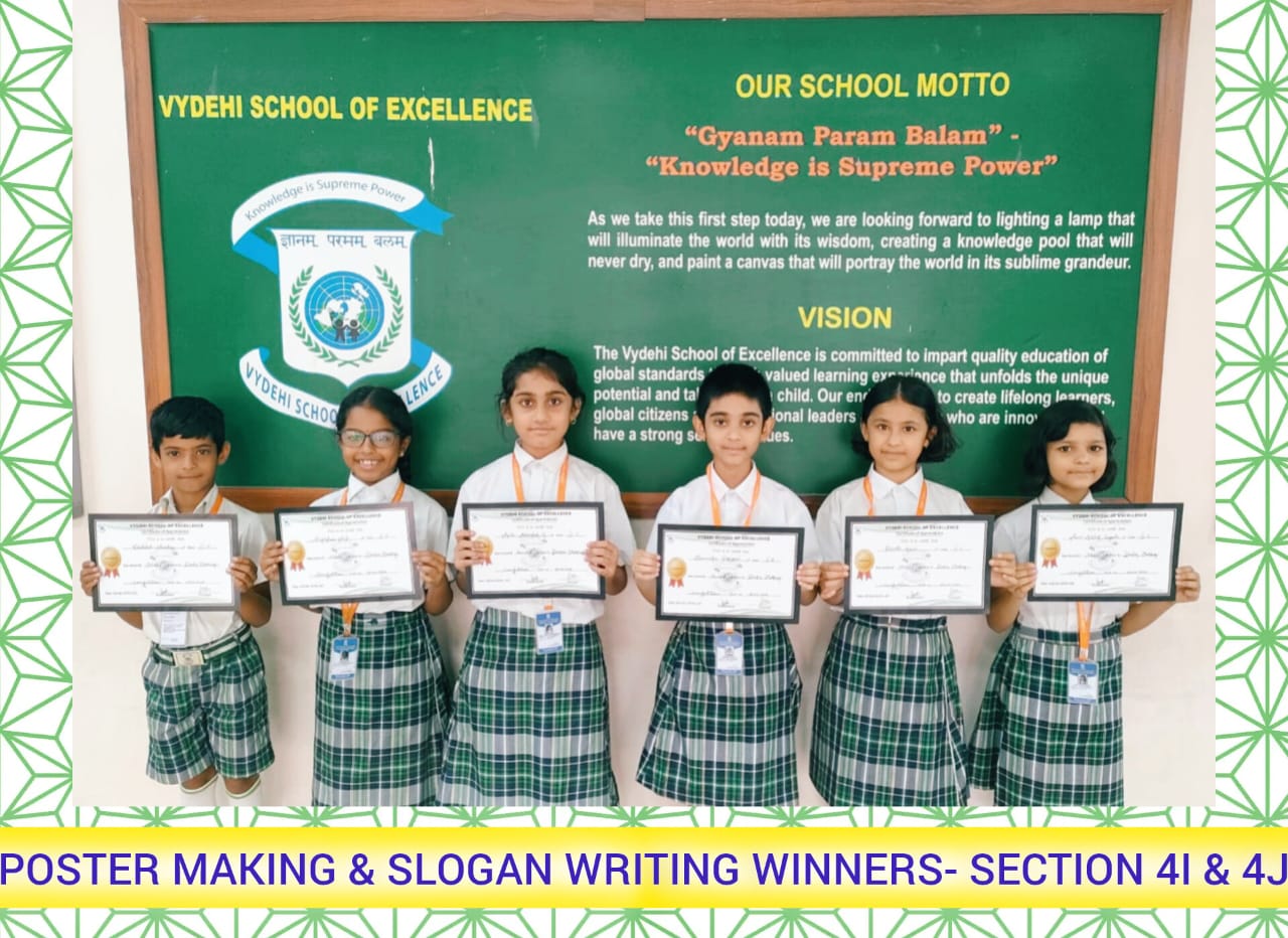 Grade 4 CCA Poster Making and Slogan Writing Competition took place on the 18th of June 2024 at Vydehi School of Excellence. The students enthusiastically participated, showcasing their artistic and literary talents under the theme “Nurture the Nature.” Each stroke of colour and carefully curated slogan emphasized the importance of environmental stewardship. The event was a resounding success, with each participant showcasing their unique perspective on the beauty and importance of nature in our lives. The vibrant colours and thoughtful slogans served as a reminder for all of us to make a conscious effort to protect and nurture our environment for future generations to enjoy.