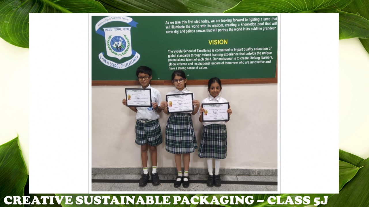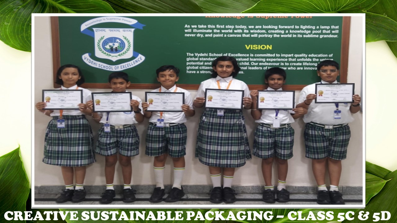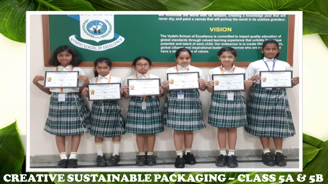Vydehi School of Excellence hosted a CCA competition on 18th June, 2024 for grade 5 students on the theme of “Innovative Ideas for Sustainable Packaging”. The objective was to encourage students to come up with creative and eco-friendly packaging solutions.