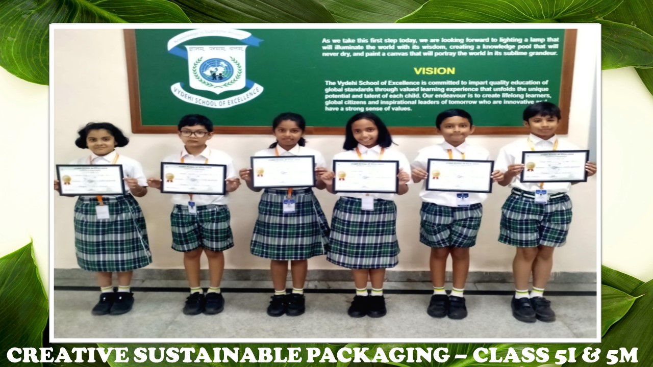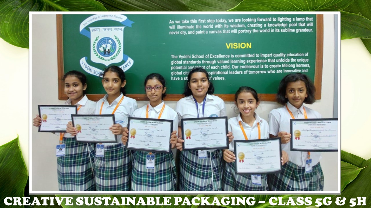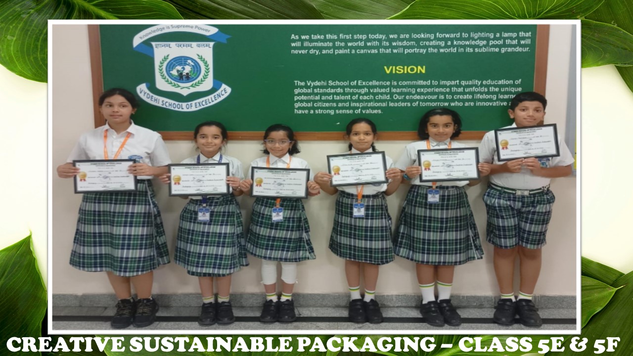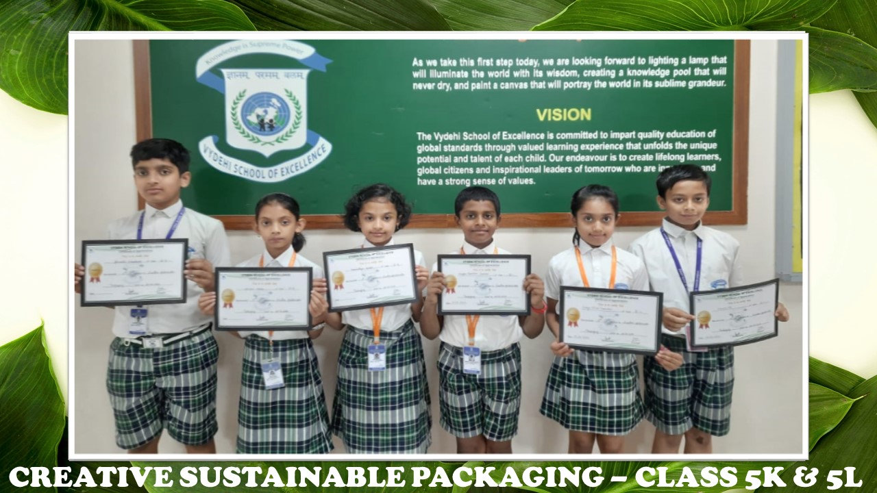 Vydehi School of Excellence hosted a CCA competition on 18th June, 2024 for grade 5 students on the theme of “Innovative Ideas for Sustainable Packaging”. The objective was to encourage students to come up with creative and eco-friendly packaging solutions.