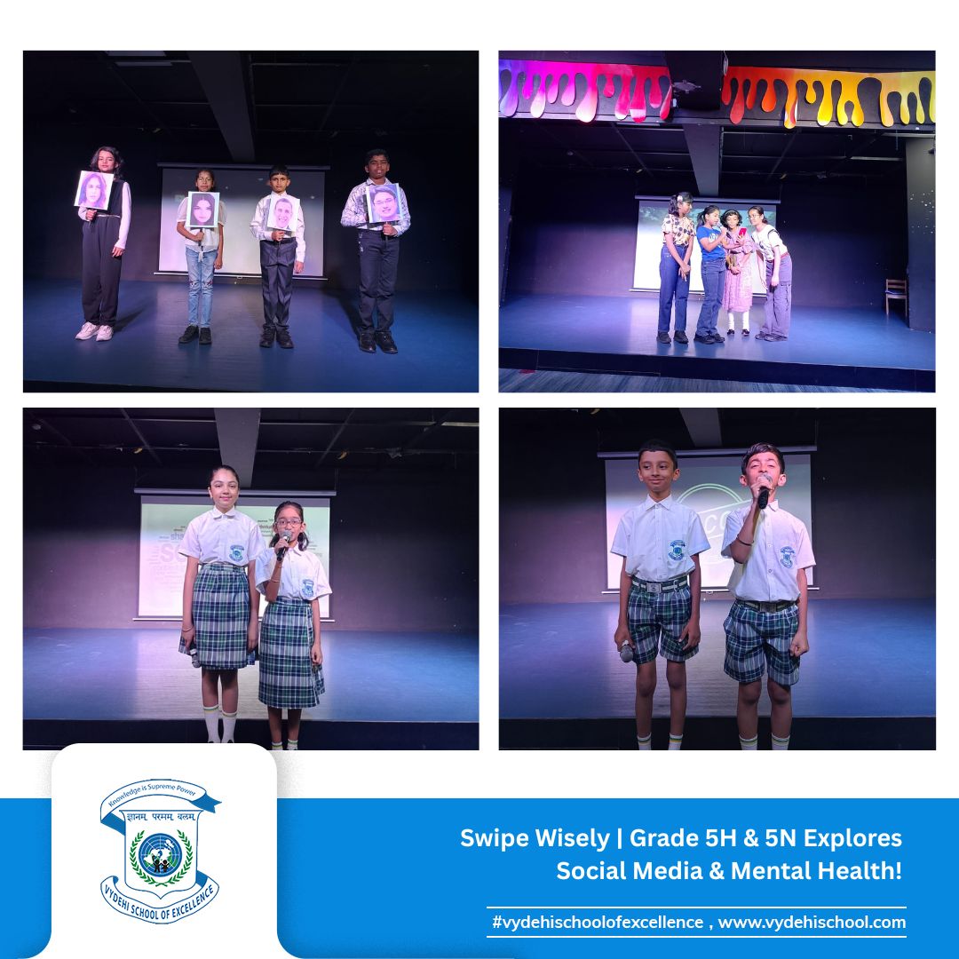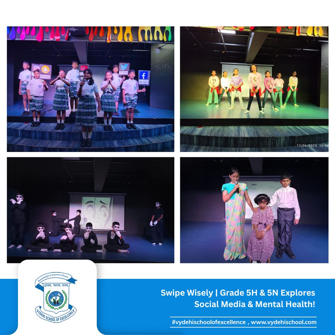 On June 17, 2025, students of Grade 5H & 5N at Vydehi School of Excellence delivered a powerful special assembly titled: “The Double-Edged Sword: How Social Media Boosts and Breaks Mental Well-being” 🎭📲