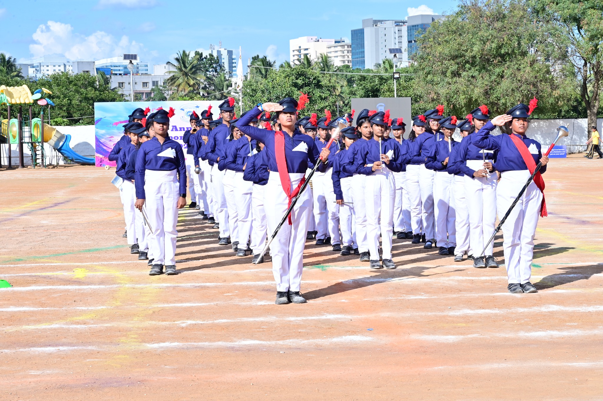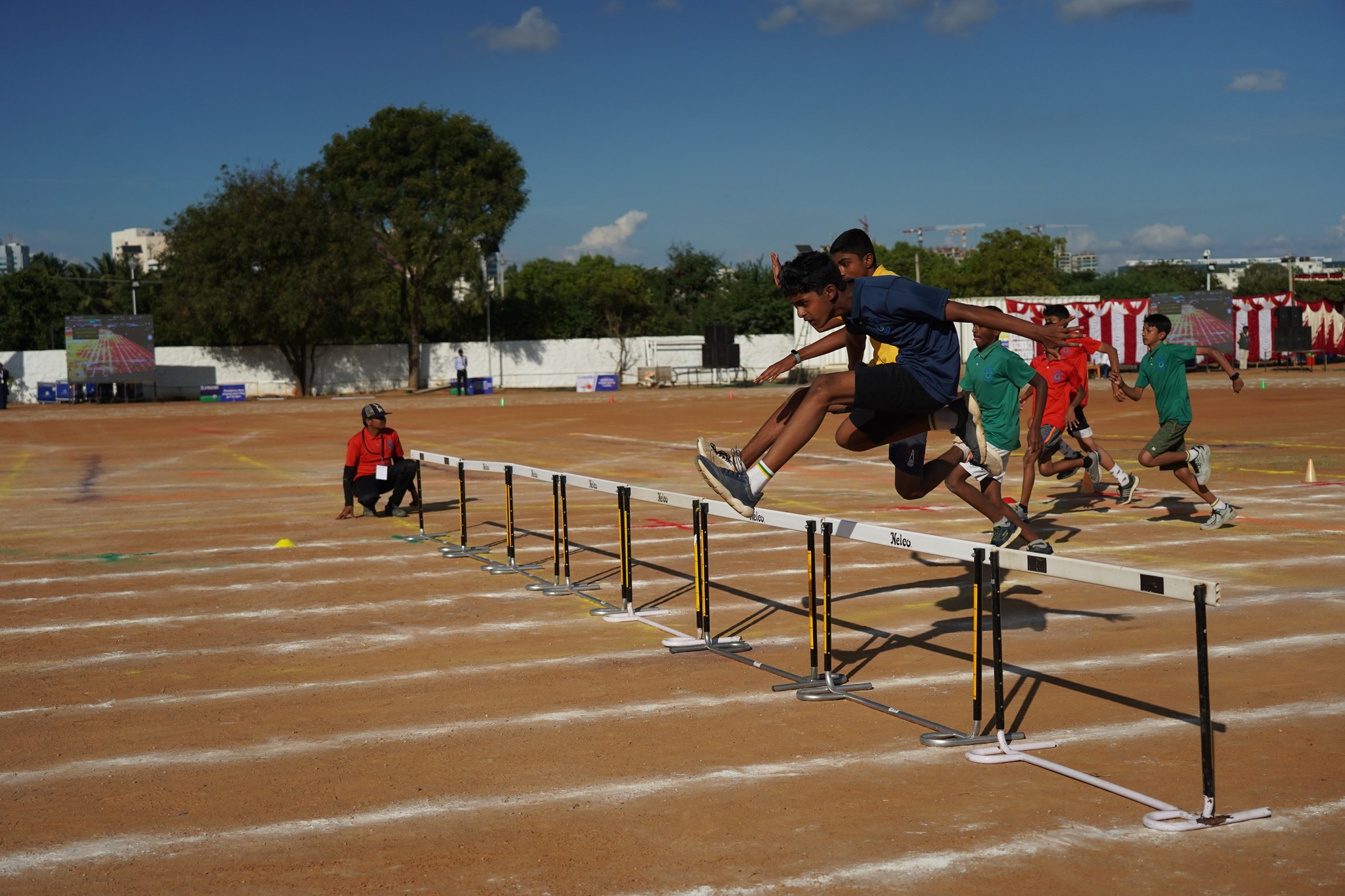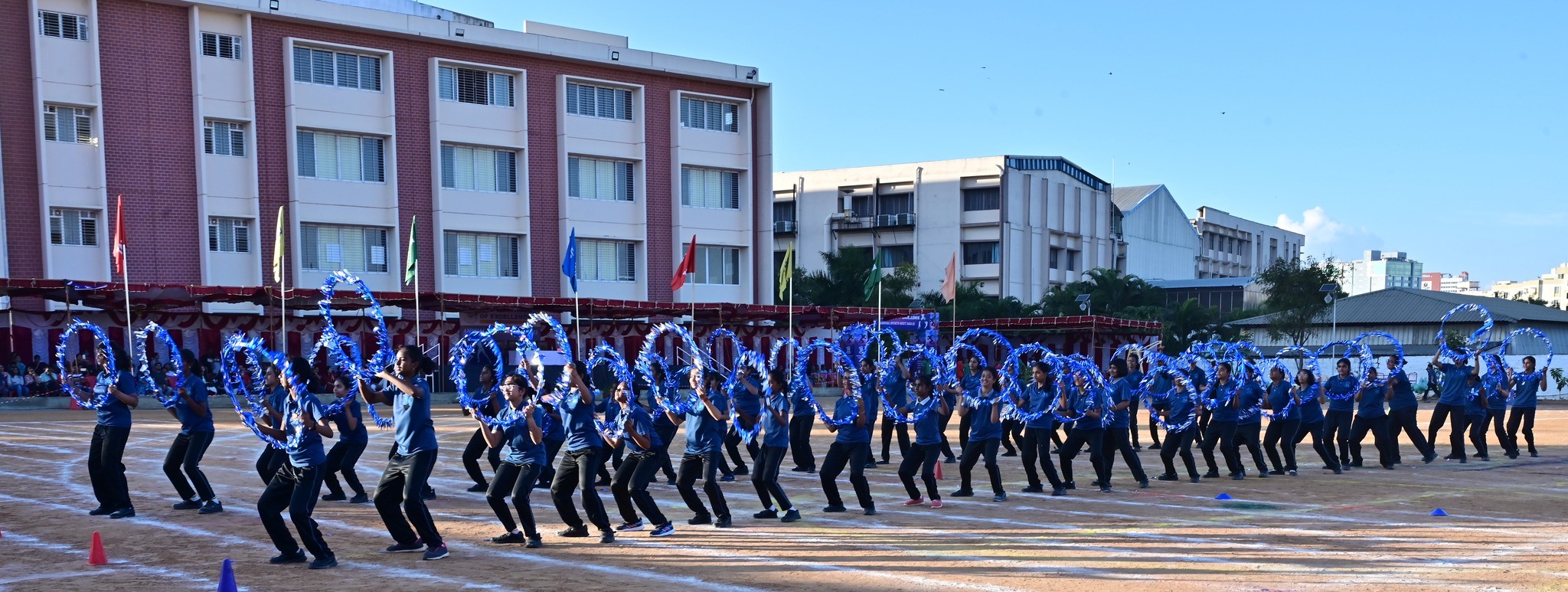 The programme began with the arrival of the Chief Guest, CEO of Vydehi School of Excellence, Mr. Harjeet Kakkar. The first major highlight of the day was the torch run, followed by the release of balloons to announce the sports day open. Our dearest Principal ma’am, Ms. Sinia Sajith, gave the annual sports report mentioning the achievements of our students in many fields like Karate, Cricket, Table tennis, Athletics etc. The students displayed a wide array of energetic and bouncy sports’ events ranging from the Band display, March Past, opening ceremony with Kalaripayattu dance, track events, Mass House drill, Hoola Hoops, etc. The best house shield, best marching shield and best in Hoola hoops shield were given to Indraprastha, Nalanda & Takshila houses respectively. The students mesmerized the audience with their energetic performances.