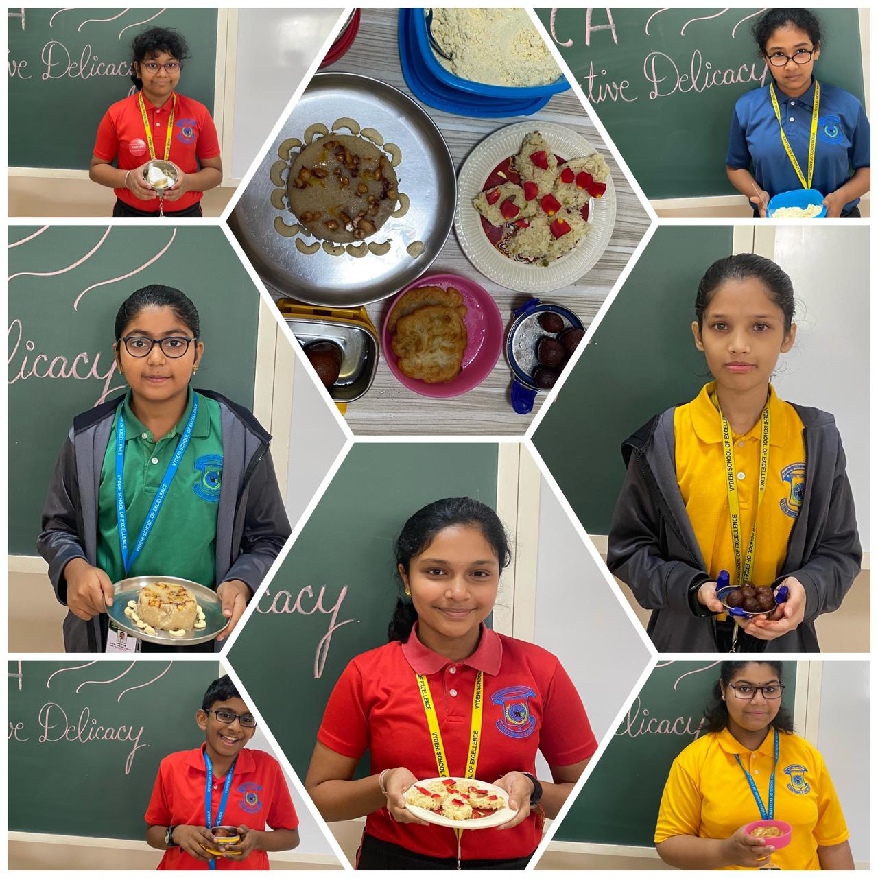 Eating is not merely a material pleasure. Eating well brings spectacular joy to life and contributes immensely to goodwill and happy companionship. It is of great importance to morale. Festivals are incomplete without food and different types of delicacies. To taste the joy of festivities in every bite, Vydehi School has organised a CCA competition on festival delicacies on October 4, 2023, for the students in grade 6. It was an amazing view to see the little chefs bringing in some festive food and presenting it with so much poise and beauty. The judgment was made on the basis of taste and presentation. It was a startling display of platters and a pleasure for the tongue.
