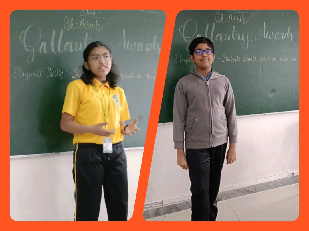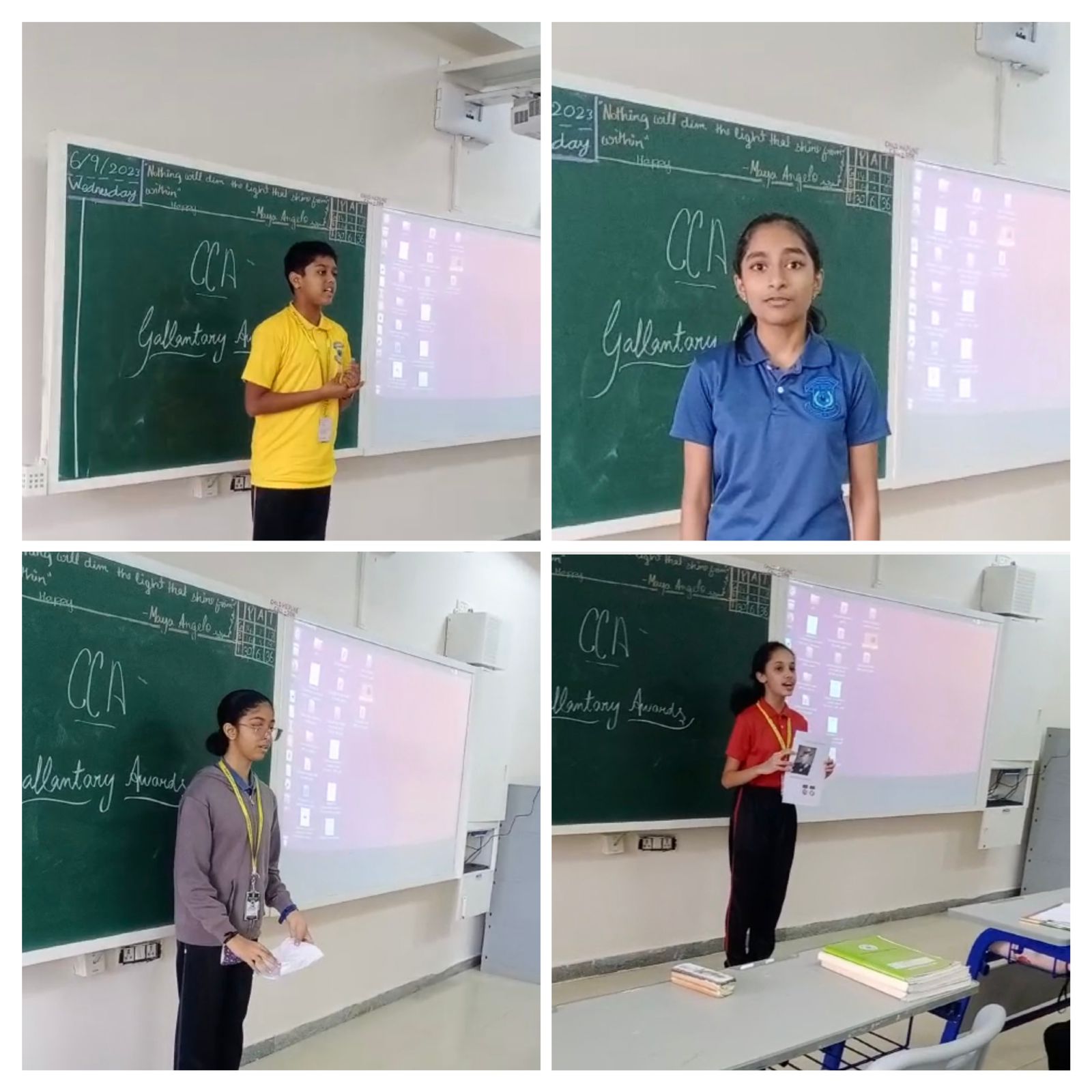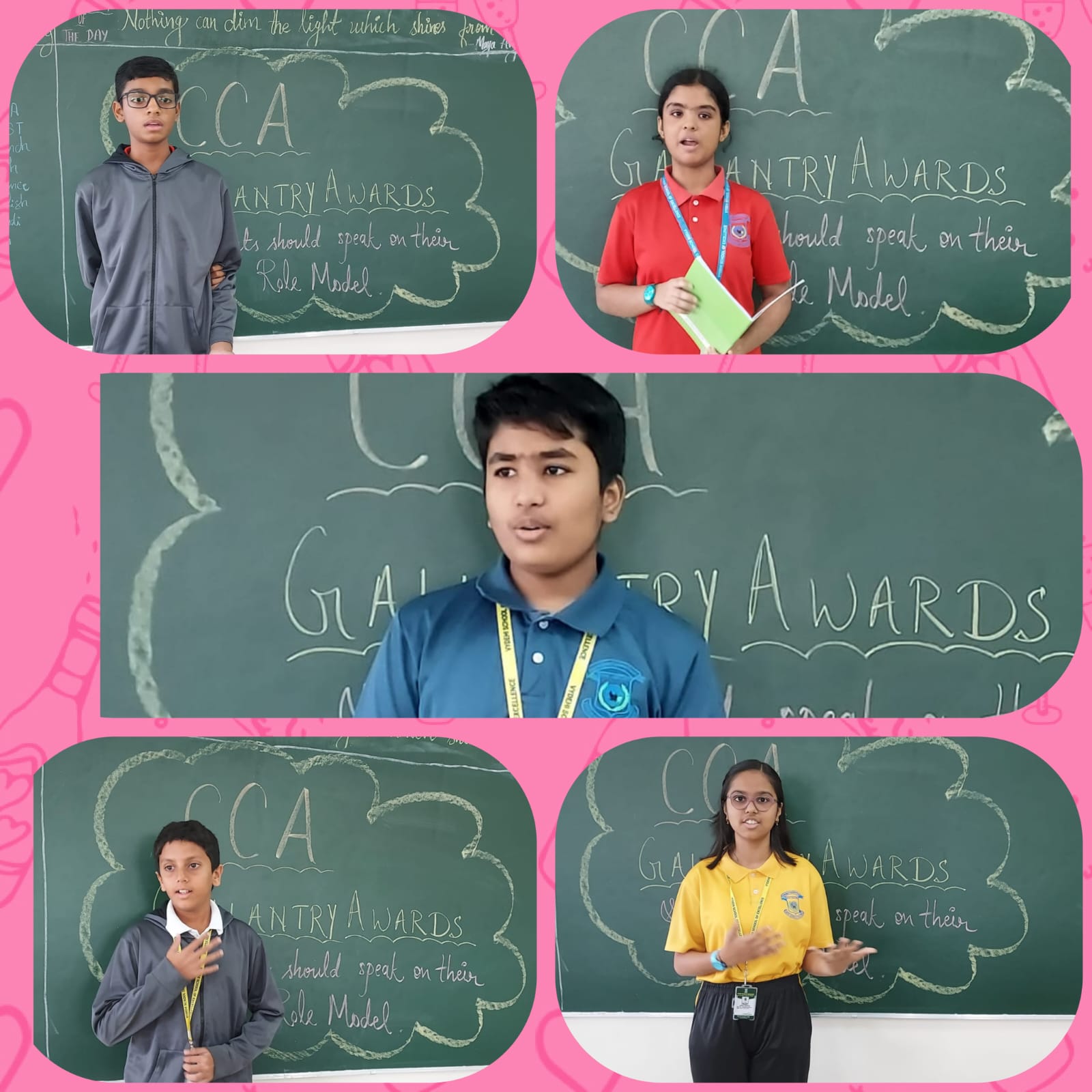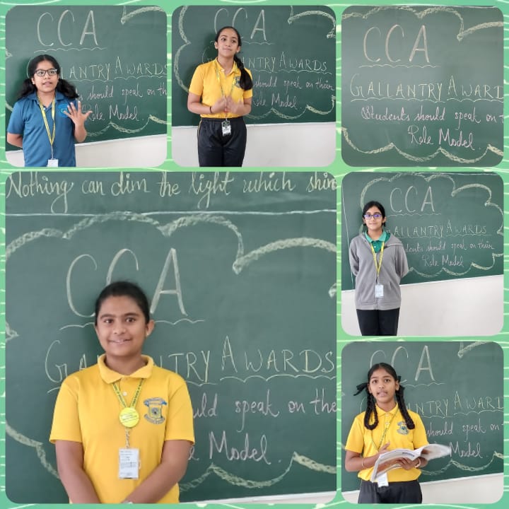 As a dazzling display of eloquence and reverence, our school Vydehi School of Excellence recently hosted the CCA activity for the month of September where students of class 8 celebrated their heroes and inspirations in the “GALLANTRY AWARDS- Role Model Speech Competition.” The event was nothing short of awe-inspiring, as young minds took center stage to pay tribute to the giants who have left an indelible mark on their lives.