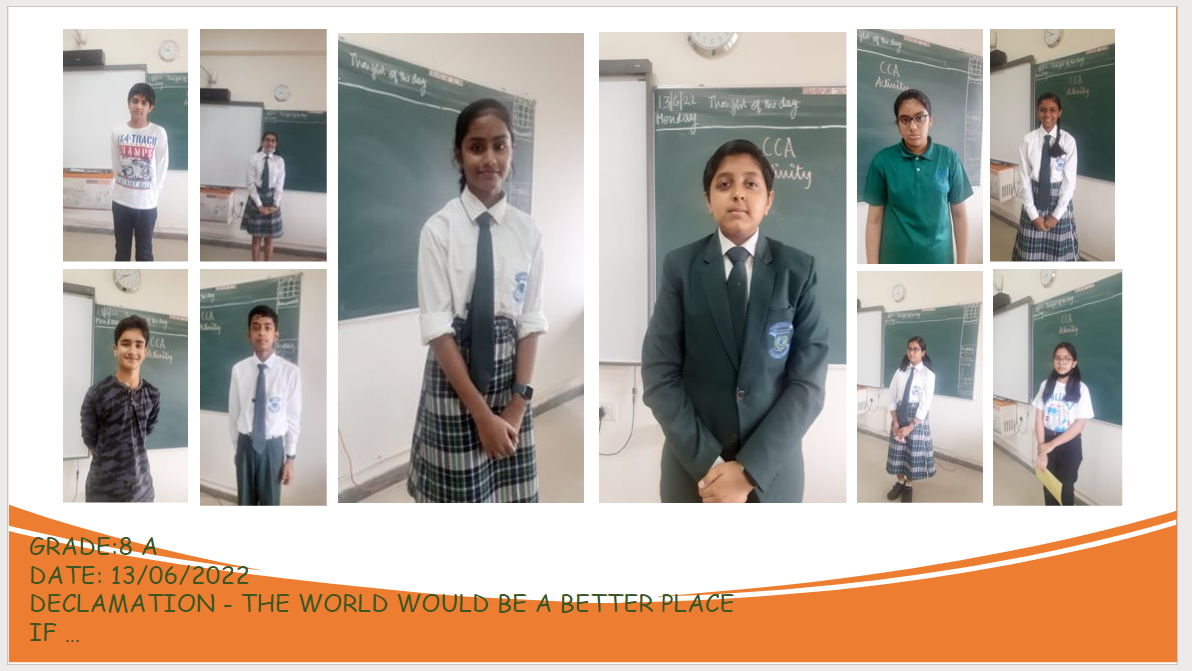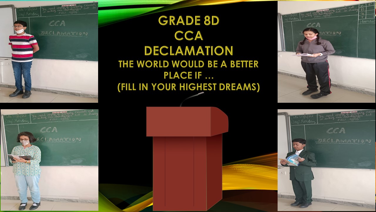 The world itself is beautiful with its imperfection, but we should always try to make it a better place for the generations to come. As it is wisely said that children are the future of the world, we, in our school, “VYDEHI SCHOOL OF EXCELLENCE”, decided to take our CCA programme as an opportunity to look into the imagination and inspiration that is there in the minds of our students of grade 8 by organising a competition of DECLAMATION on the topic THE WORLD WOULD BE A BETTER PLACE IF … (FILL IN YOUR HIGHEST DREAMS).