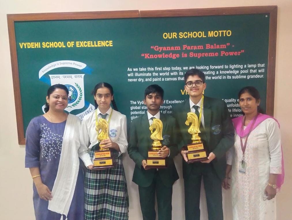The Inter-School Chess Tournament hosted by the East point School, Bangalore, on 3rd and 4th of February 2024 in three categories of sub juniors, Juniors and Seniors, gave a stupendous platform to our students of Vydehi School of Excellence, who showcased fierce intellect and strategic prowess as they battled for supremacy. The atmosphere was charged with anticipation and concentration as young minds engaged in mental warfare.
