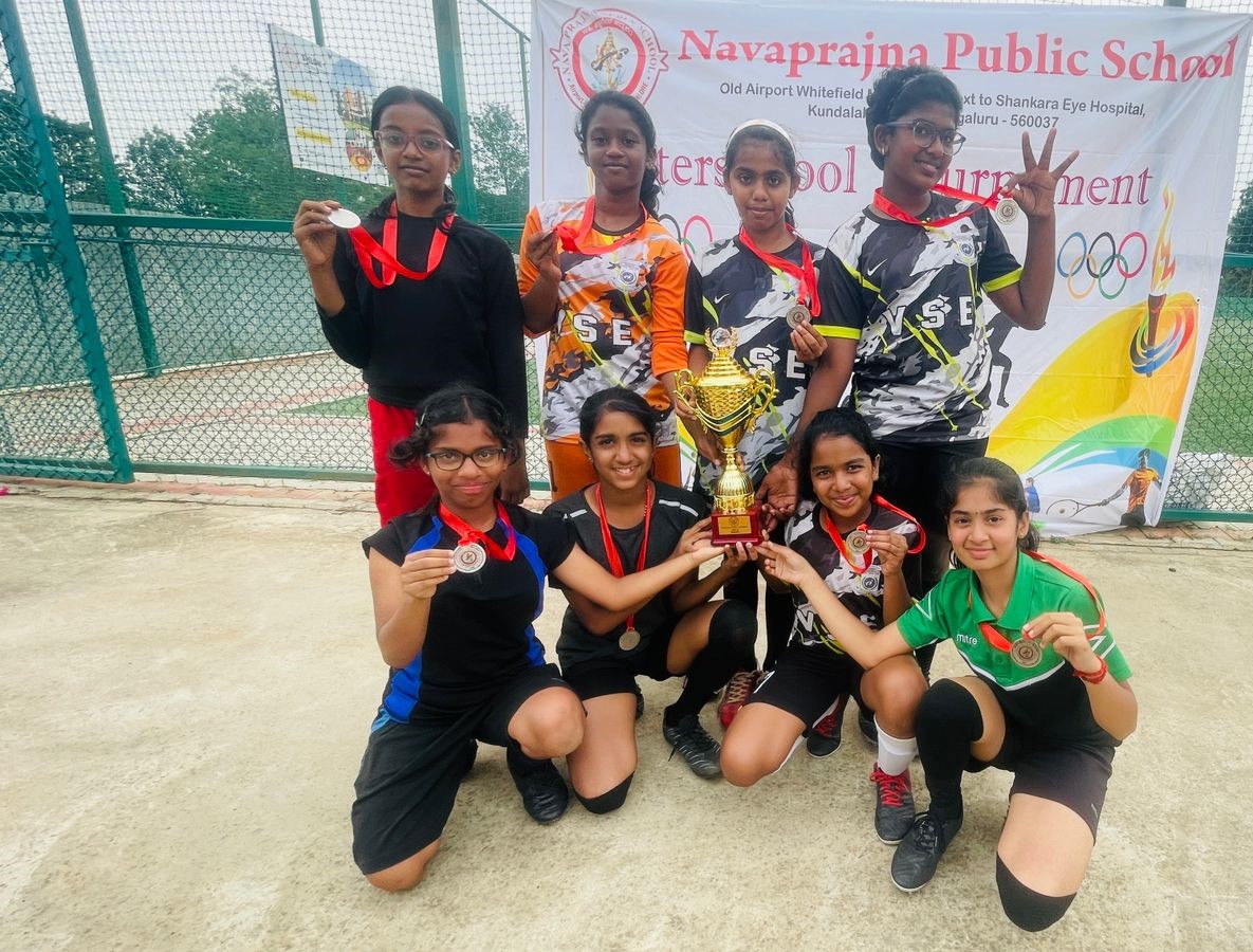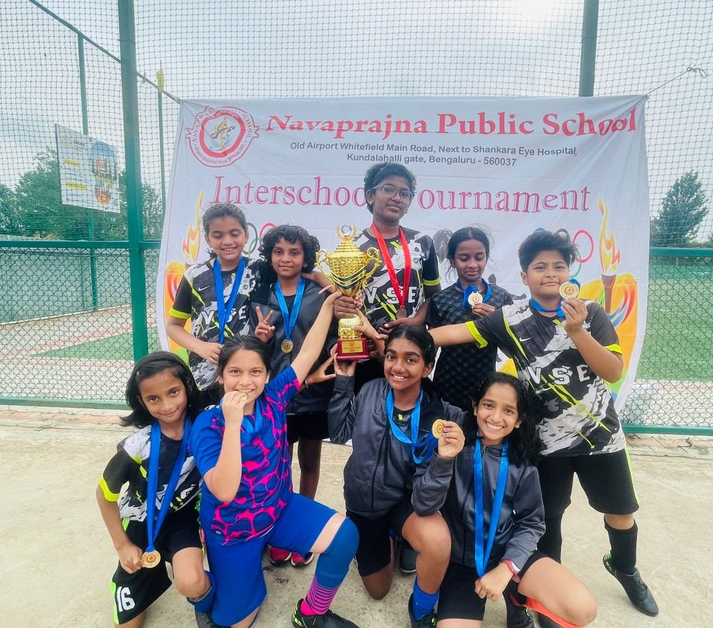 The Vydehi School of Excellence football team delivered an exhilarating performance in their recent interschool football tournament organized by Navaprajna Public School, Bengaluru, on 20th July 2024, securing a well-earned victory. U-13 girls bagged the runners up trophy whereas U-11 girls grabbed the winner position. This win highlights the team’s skill, strategy, and unyielding determination.