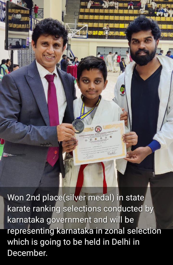 We are proud to announce that, the students from VYDEHI SCHOOL OF EXCELLENCE, SHREERAM OF GRADE 6F & HARIHARASUDHAN OF GRADE 6B WON SILVER MEDAL IN 11 YEARS -40KG KUMUTE CATEGORY & GOLD MEDAL IN 11 YEARS +45KG KUMUTE CATEGORY respectively in State Karate ranking selections conducted by Karnataka government held in Koramangala indoor stadium on 5th November 2022 and will be representing Karnataka in Zonal selections to be held in Delhi on December 3,4,5.