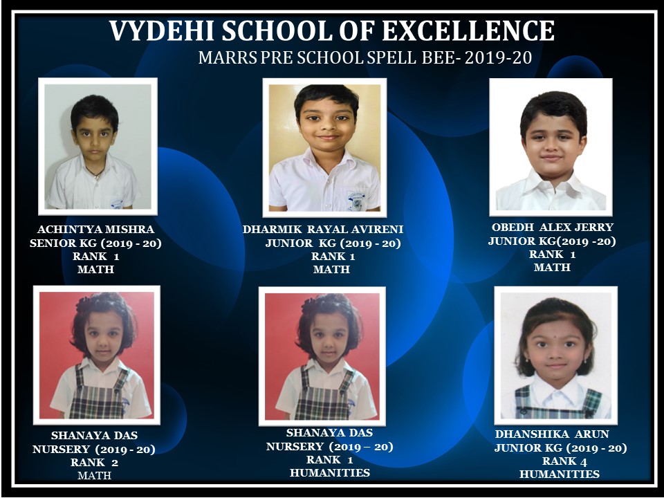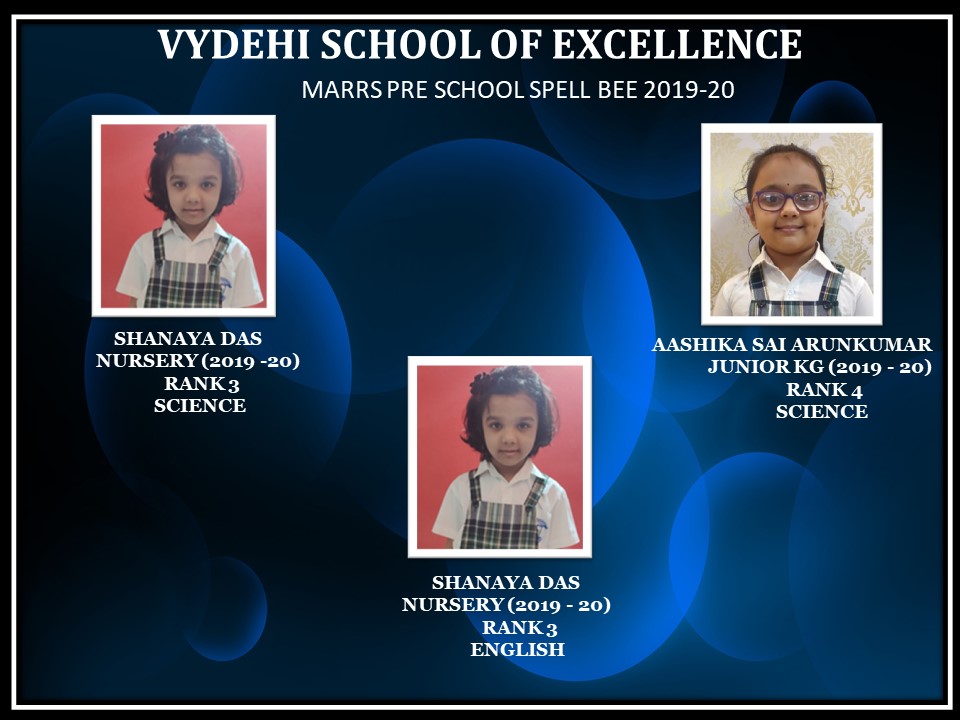 A spelling bee helps the students gain the confidence they need to speak in public and accept their mistakes, while also getting the applause their hard work deserves. It can spark a love of language and learn in children will serve them well throughout their entire lives. The literacy, cognitive and life skills that they develop through study and competing have benefits far beyond the scope of reaching into every aspect of life and communication. Vydehi School of Excellence organized a Preschool bee competition conducted by MaRRS Spelling Bee to initiate students into the world of competitive learning. We are proud to announce that our students have cleared the state level and progressed to the National level.