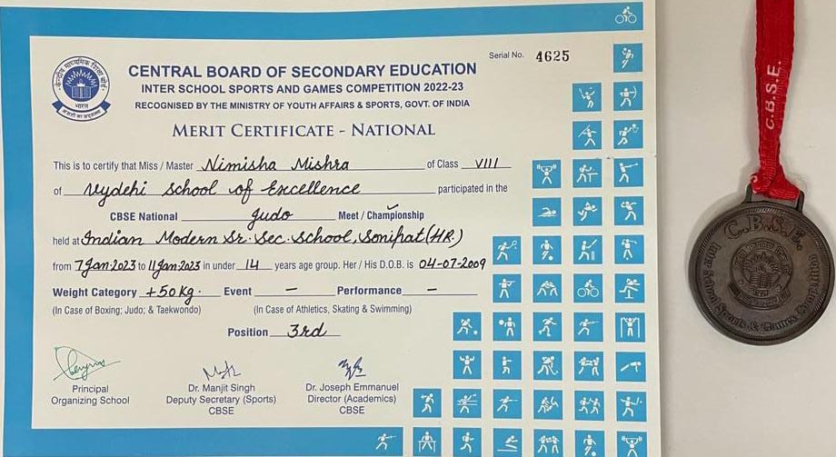 VYDEHI SCHOOL OF EXCELLENCE is proud to announce Nimisha Mishra of Grade 8 has won Bronze medal in Pan India Level CBSE Nationals judo competition held in Sonipat under 14 age 50Kg+ weight category.