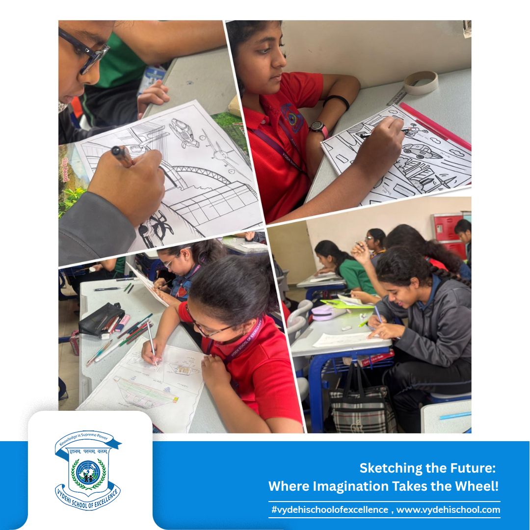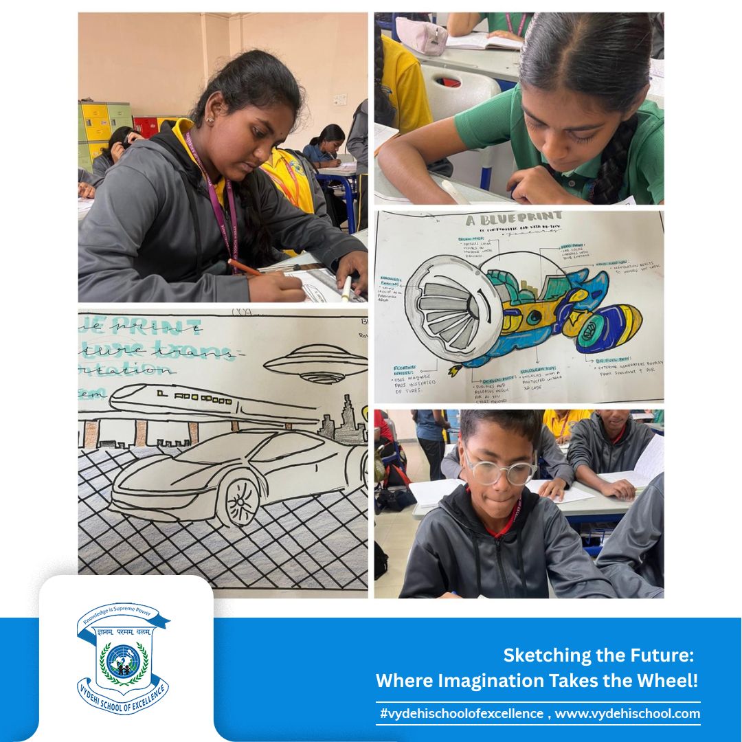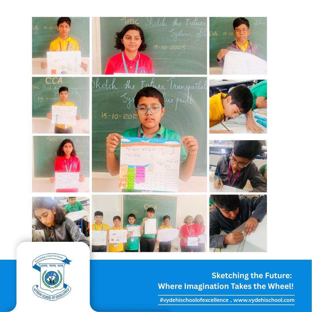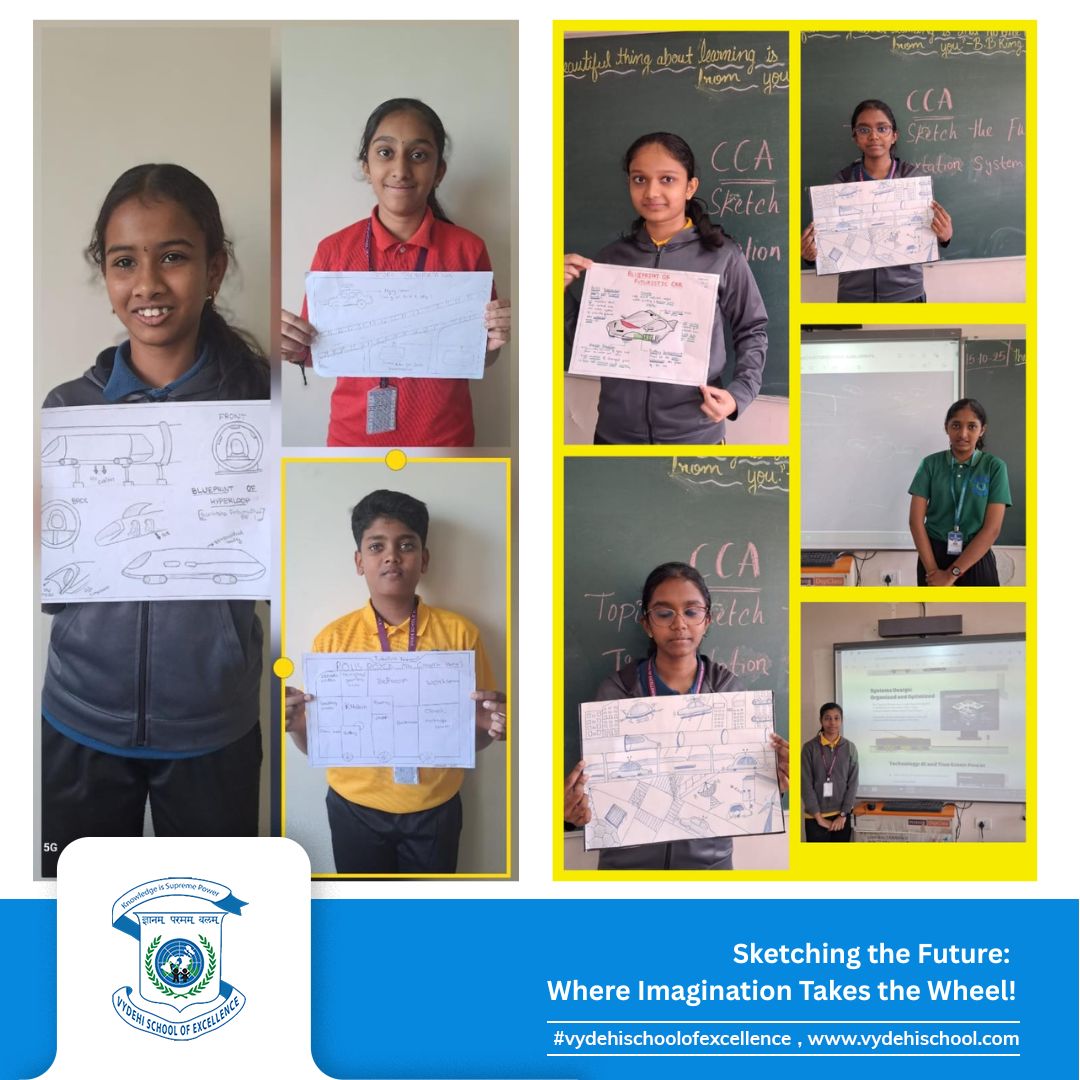 The Grade 8 visionaries of Vydehi School of Excellence took creativity to new heights on 15th October 2025 with the CCA Activity – “Sketch the Future Transportation System Blueprint.” 🎨🚗