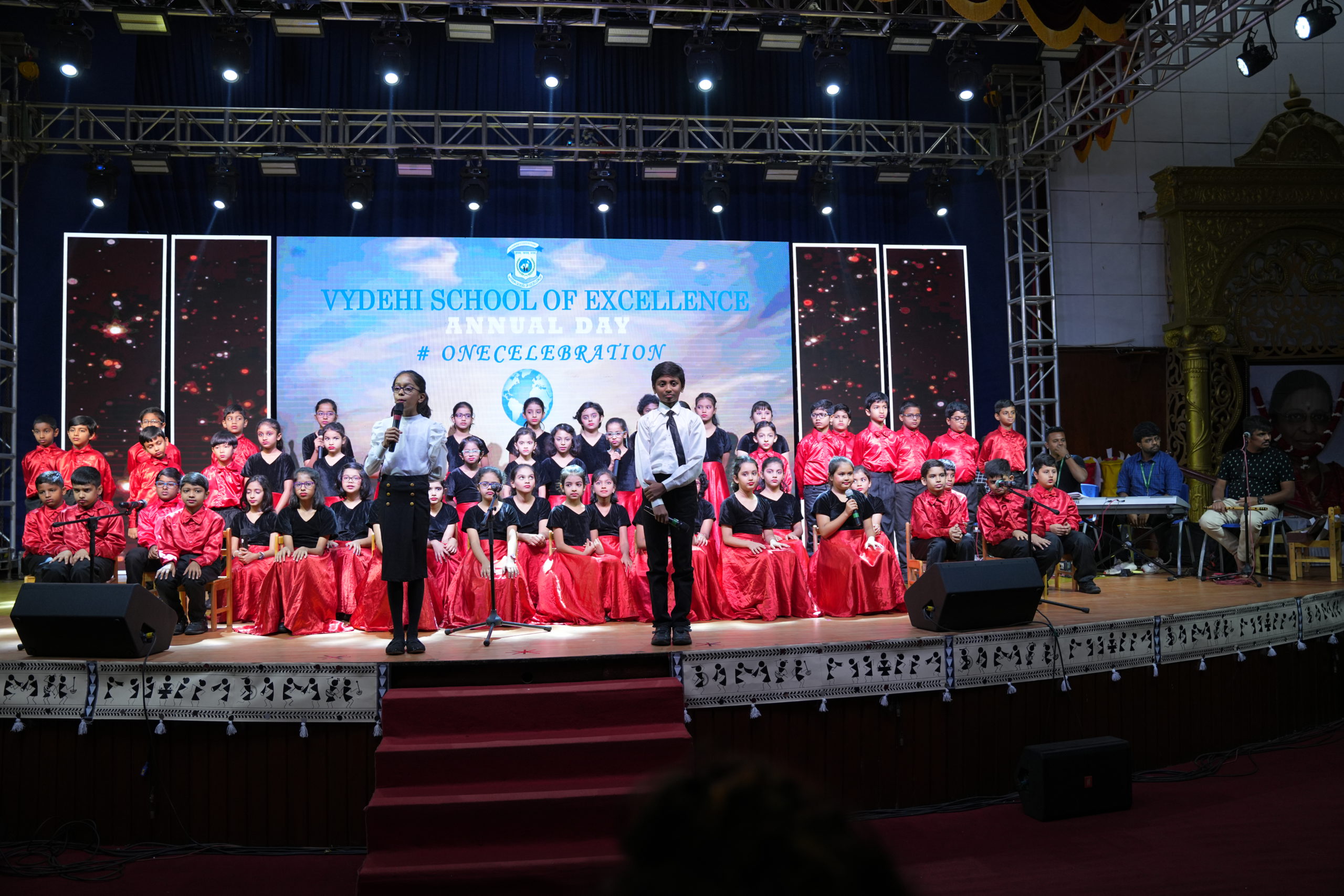 Vydehi School of Excellence celebrated its Annual function on 20th and 21st of January 2024, with its tremendous celebration including a series of programs prepared with exceptional effort and perfection. The theme of the event was #Onecelebration. The event aimed to instill a sense of environmental consciousness among the students and foster a deeper understanding of our interconnected world. This narrative served as the foundation for a series of engaging events, uniting the students in a shared celebration of our planet. – a commitment that unites us all in the rhythm of a sustainable future.