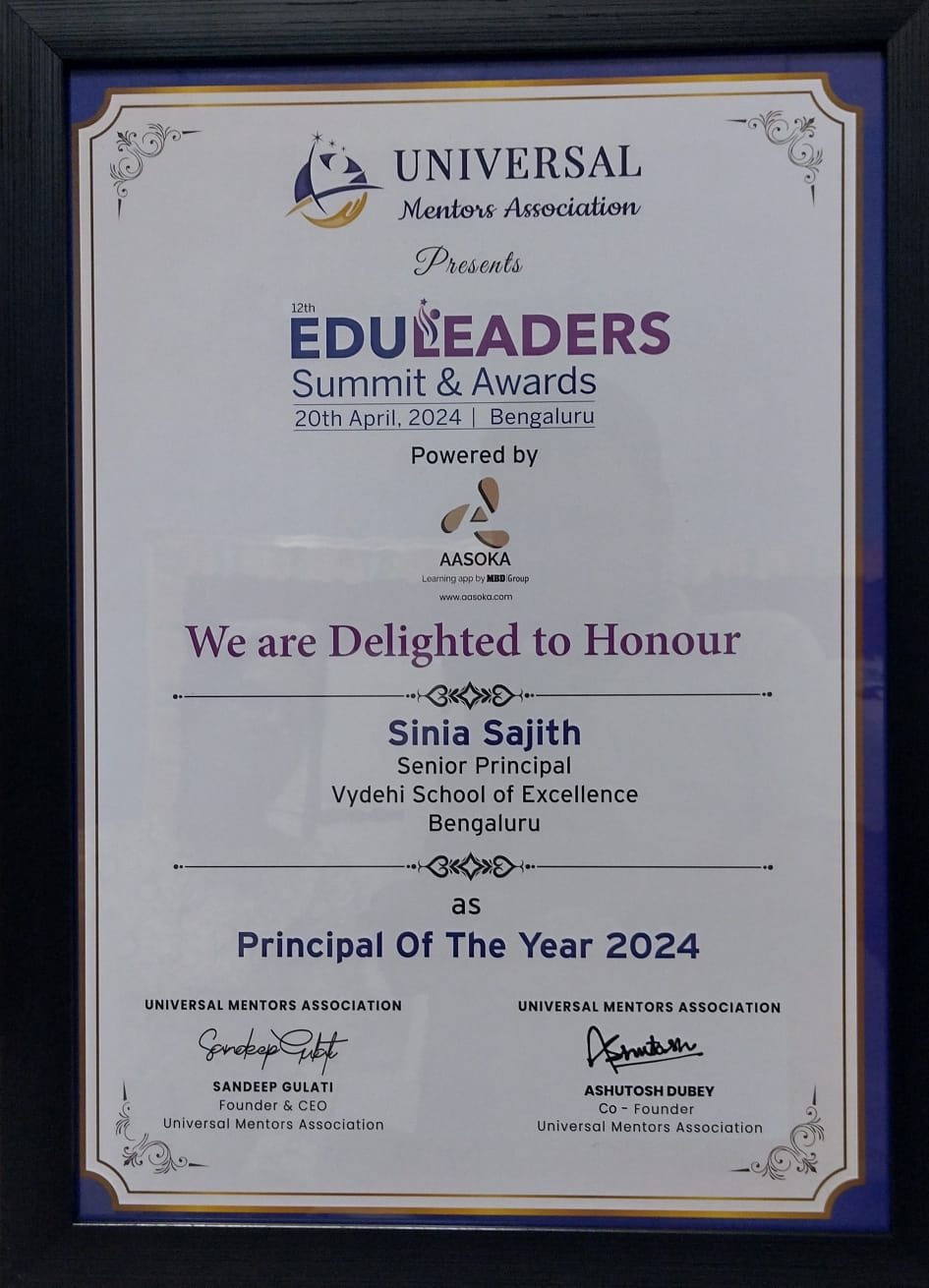 We are thrilled to announce that our dearest senior principal, Vydehi School of Excellence, Ms. Sinia Sajith, has been honoured with the prestigious title of Principal of the year 2024 🌟 by Universal Mentors Association in the 12th Edu Leaders Summit & Awards on 20th April 2024 in Bengaluru, Karnataka.