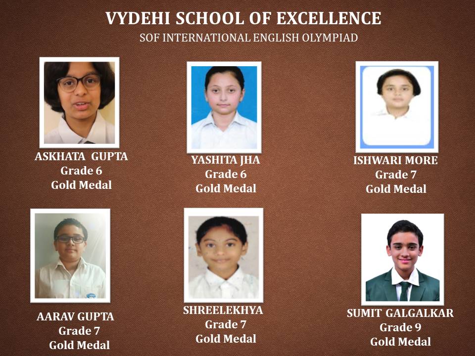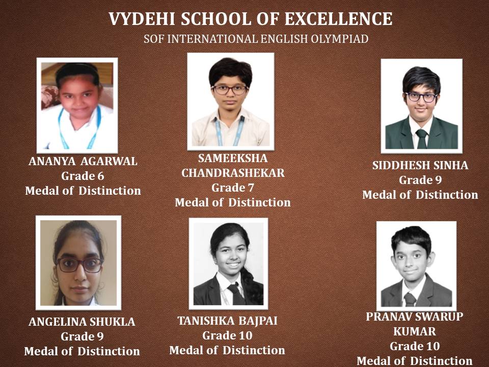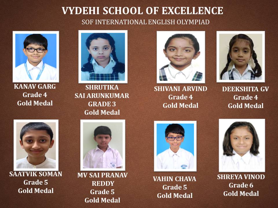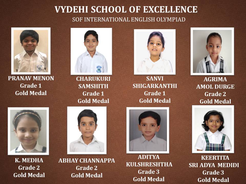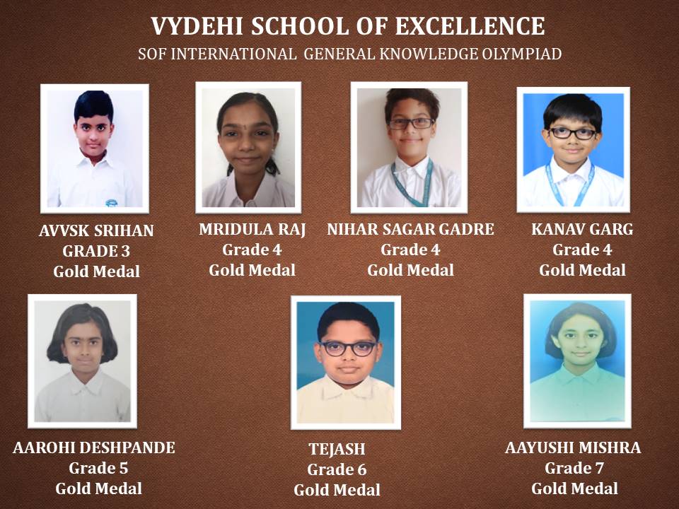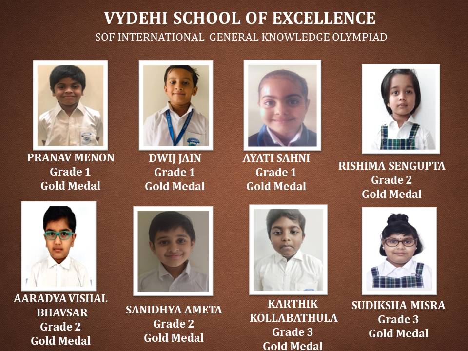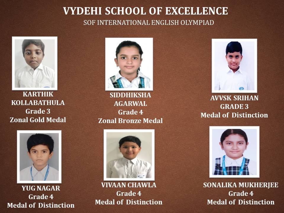 Olympiad exams evaluate the conceptual learning, reasoning, analytical, and problem-solving skills of a student from an early age. It aims to provide a unique competitive platform to identify the young geniuses and create future talent pool. Disseminate knowledge and information on the latest developments in science and technology and other subjects, Science Olympiad Foundation (SOF) conducted various academic competitions for our students. Vydehi School of Excellence is proud to announce the various level winners of SOF International English & General Knowledge Olympiad.
