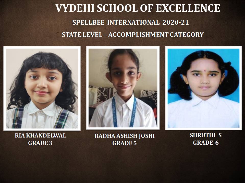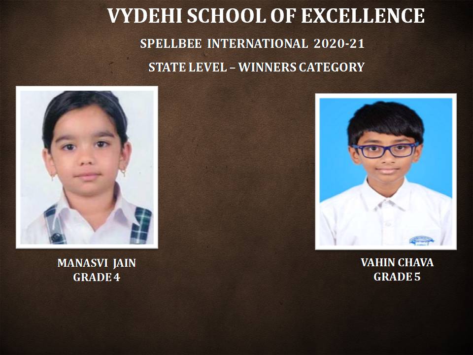 To improve the learning skills of Grammar, enhance Vocabulary and to inbuilt the confidence as well as the competitive spirit, Vydehi School of Excellence has organized spellbee International competitions -state level 2020-21 for our students and we are happy to announce that Manasvi Jain of Grade 4 & Vahin Chava of Grade 5 Shared the First Rank under the winners category. Ria Khandelwal of Grade 3, Radha Ashish Joshi of Grade 5 & Shruthi S of Grade 6 have been selected under the accomplishment category.