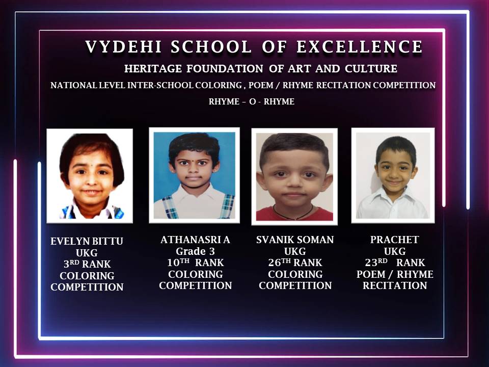 The students of VYDEHI SCHOOL OF EXCELLENCE, Evelyn Bittu and Svanik Soman of UKG & Athanasri A of Grade 3 secured ranks 3,26 & 10 respectively for their wonderful performances in the National Level Inter-school coloring competition.