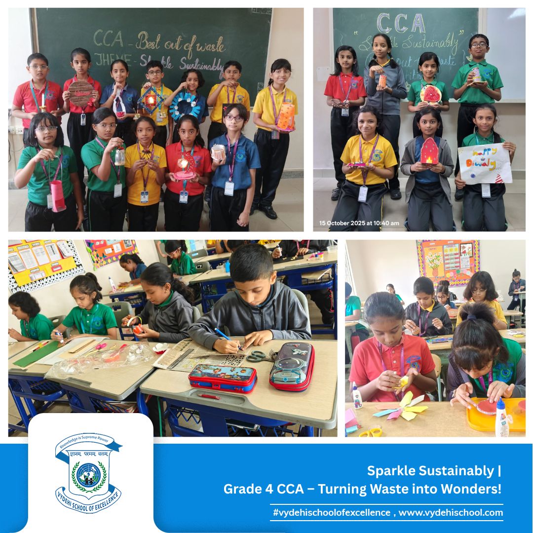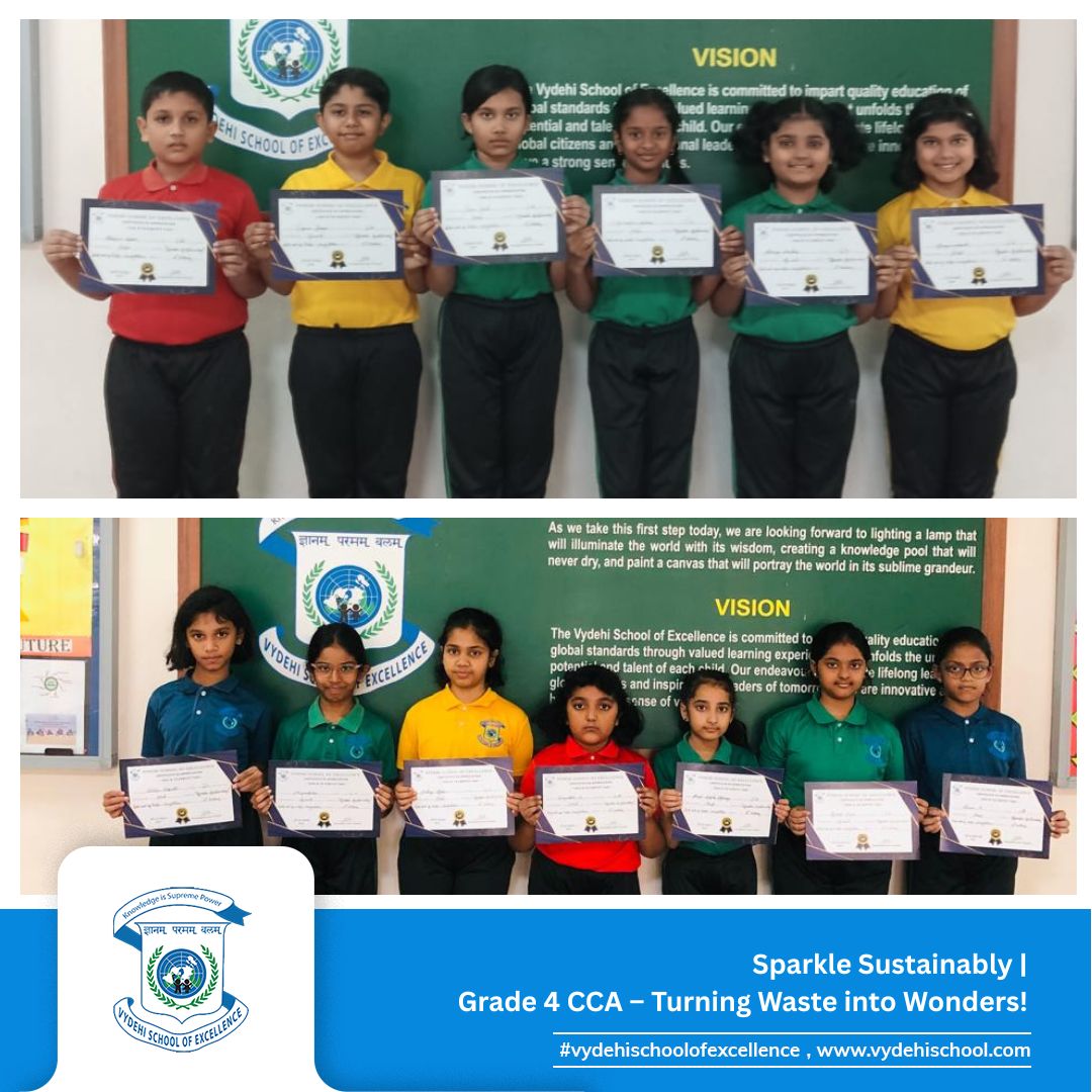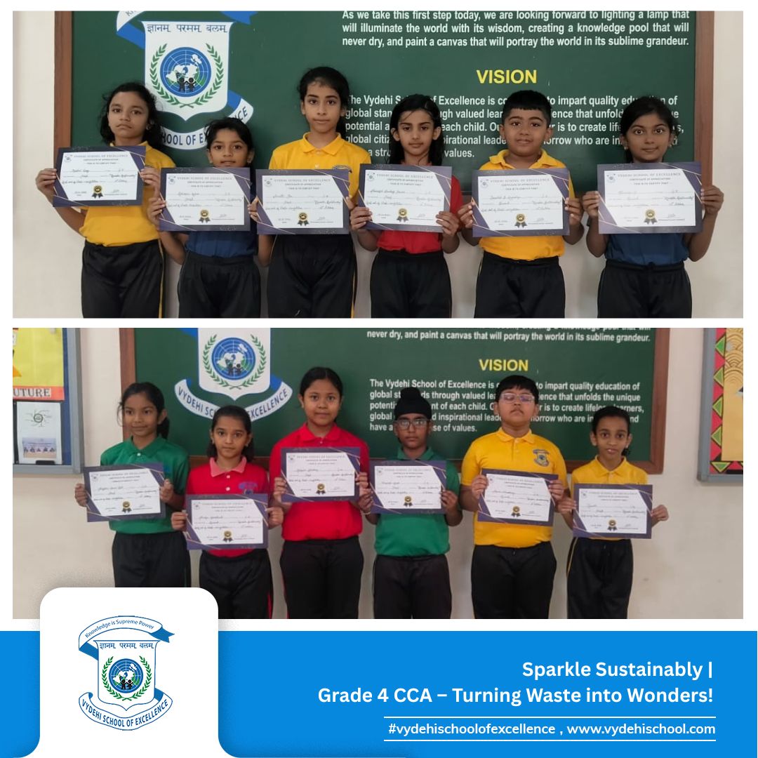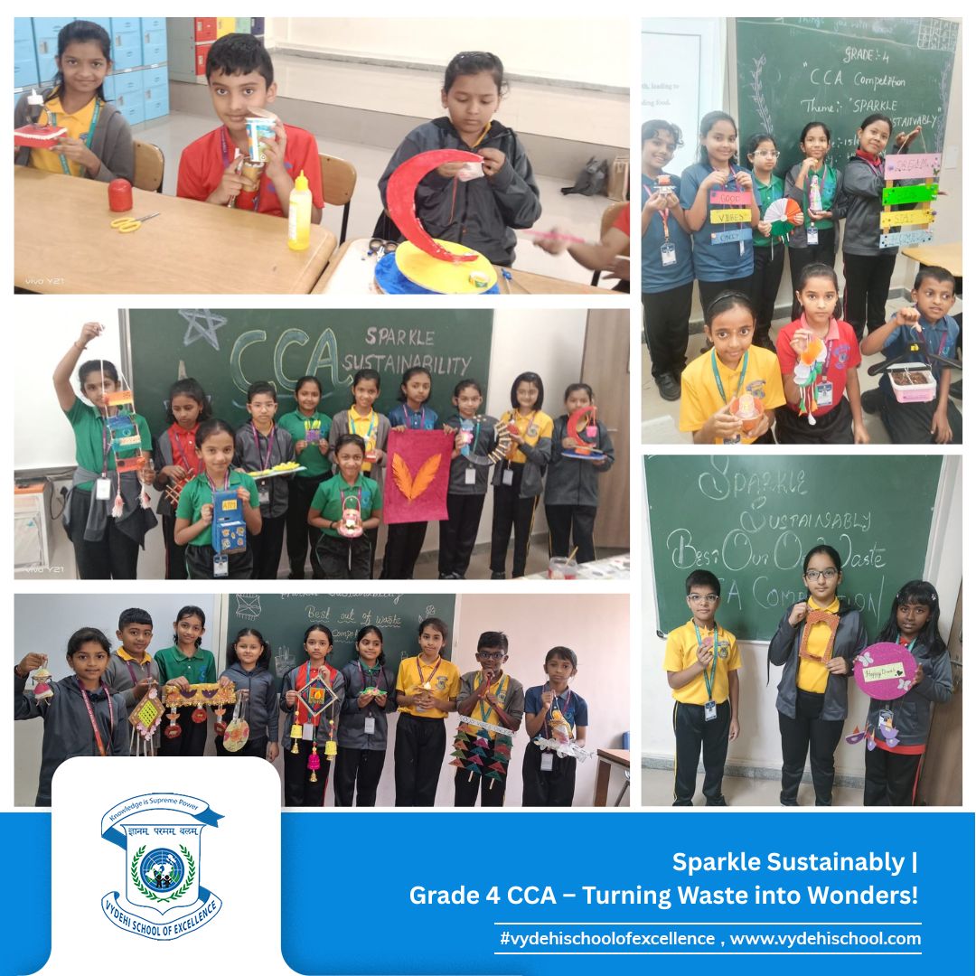 Vydehi School of Excellence shined bright on 15th October 2025 as our innovative Grade 4 students took part in the much-awaited CCA Competition β βπΈ Sparkle Sustainably πΏβ, where creativity met environmental responsibility! π