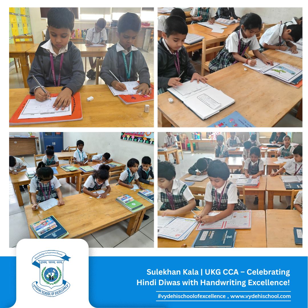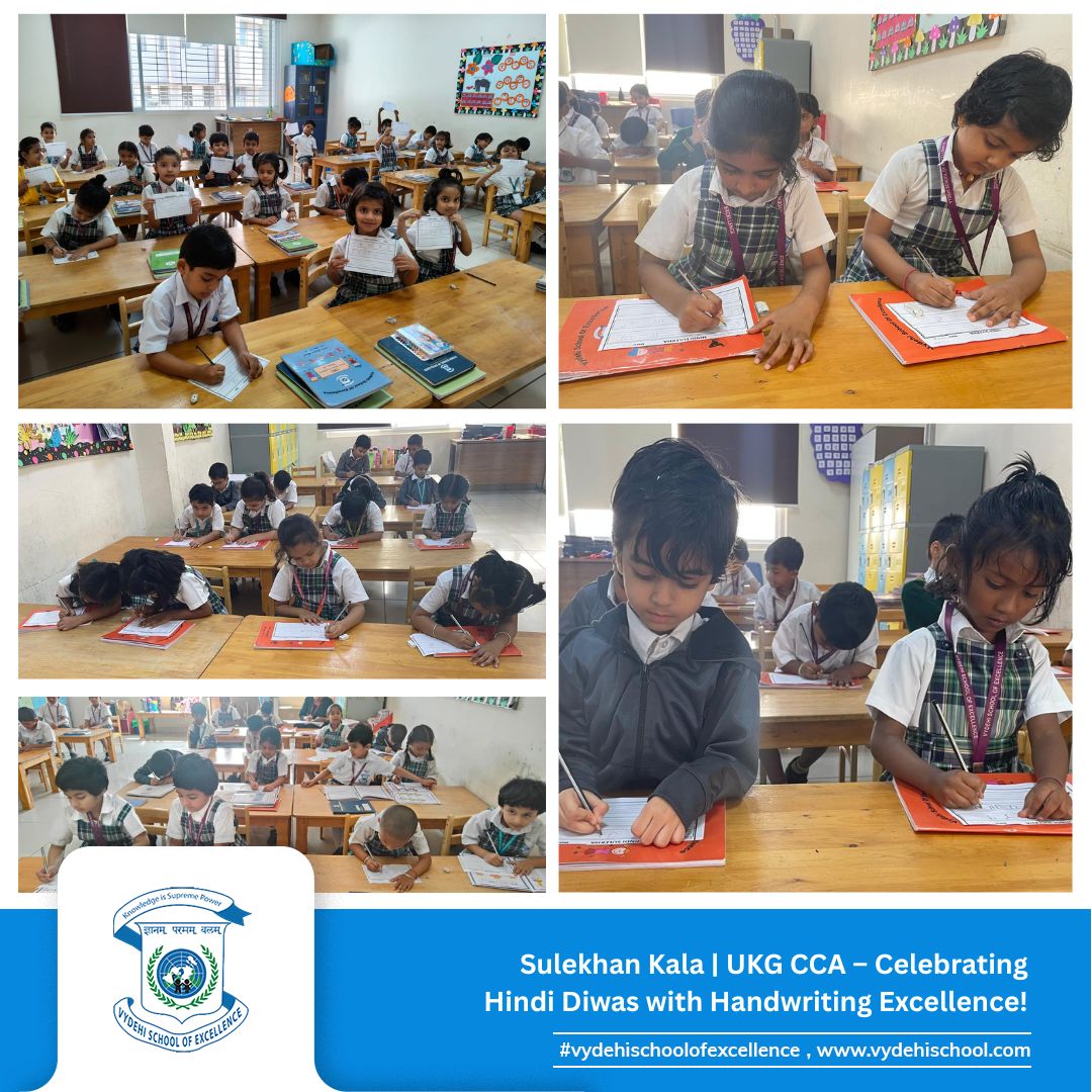 Vydehi School of Excellence proudly celebrated Hindi Diwas by organizing “Sulekhan Kala” – Hindi Handwriting Competition on 9th September 2025 for our UKG students. 🌟