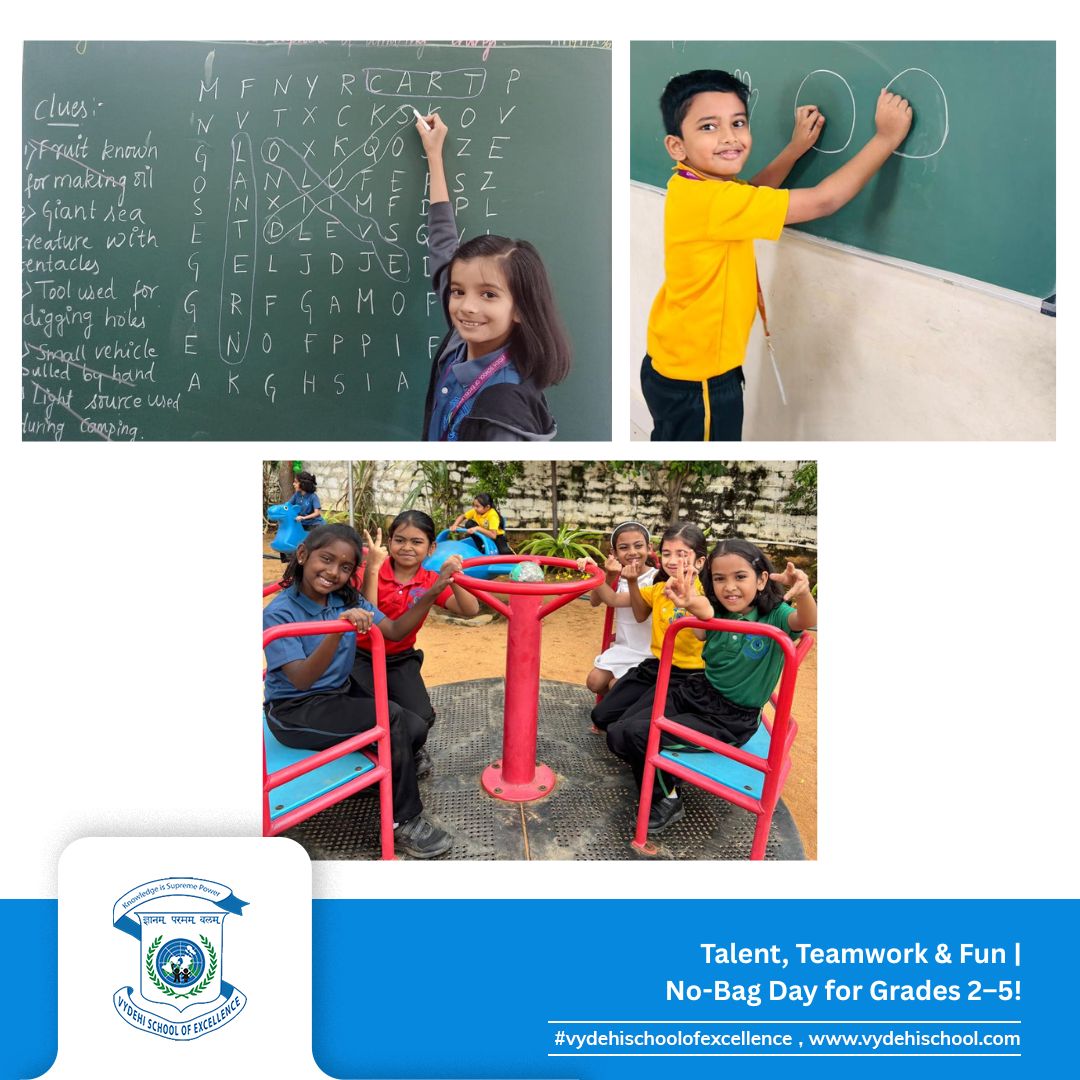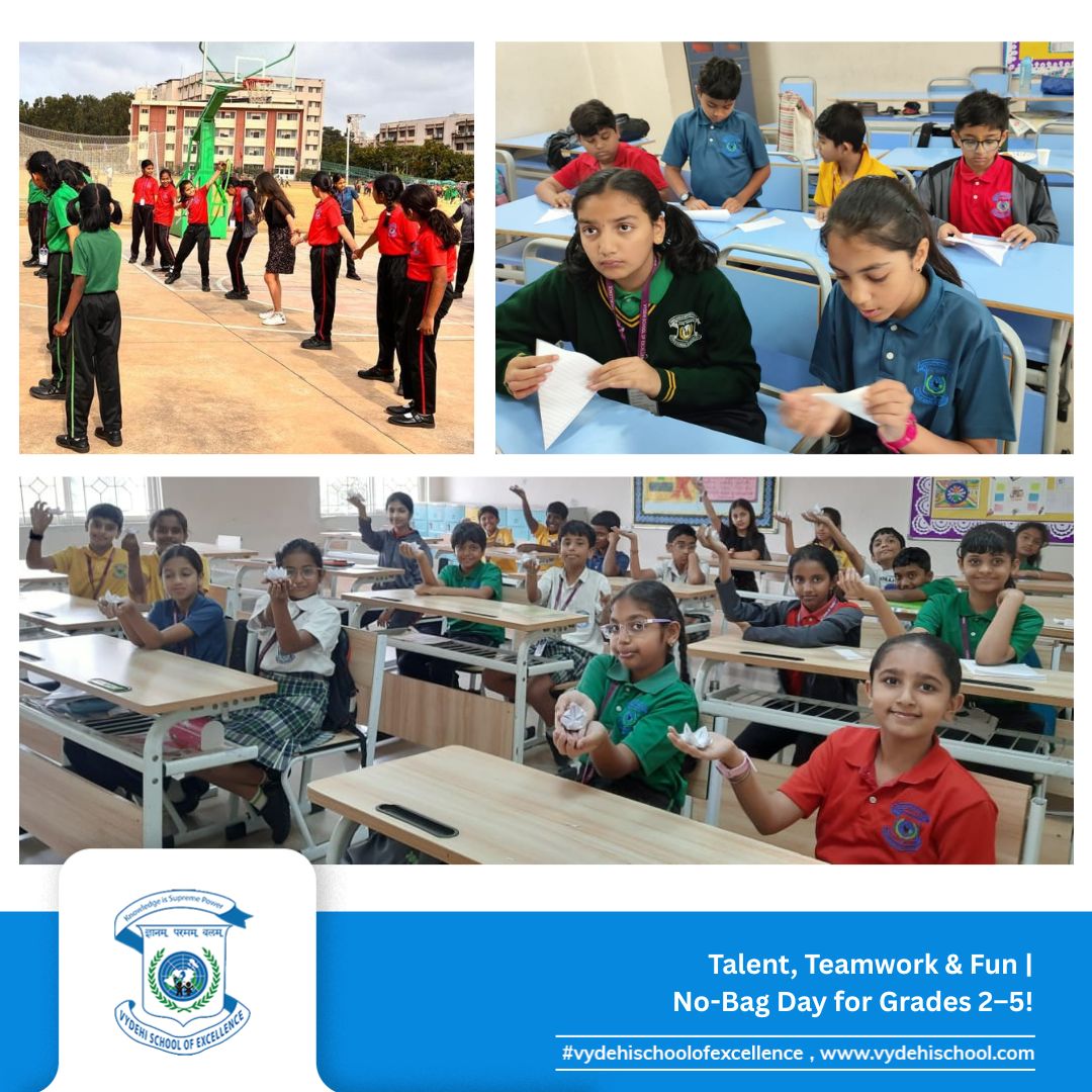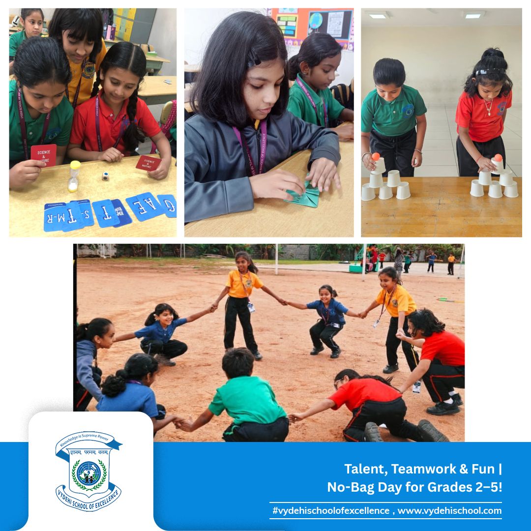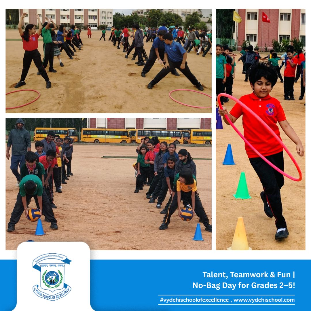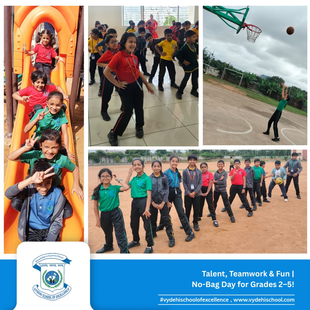 On 26th September 2025, Vydehi School of Excellence buzzed with laughter, energy, and creativity as our Primary students (Grades 2β5) celebrated a fun-filled No-Bag Day. With books set aside, the day became a canvas for exploration, imagination, and hands-on learning. π