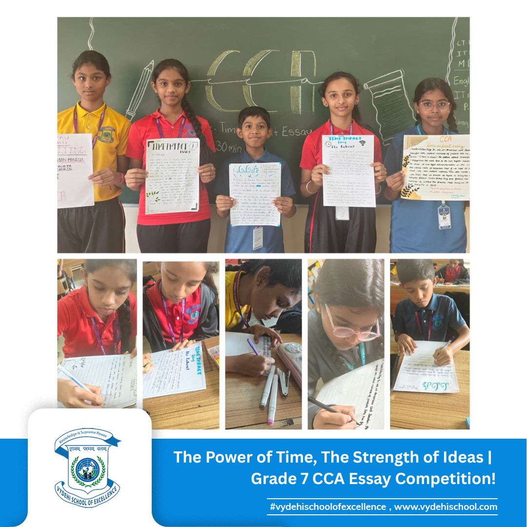 On 3rd September 2025, Vydehi School of Excellence conducted the Grade 7 CCA Essay Writing Competition on the theme โTime-Impact.โ The activity encouraged students to reflect on how historic events and personalities shape our present and influence our future. ๐๐ฎ