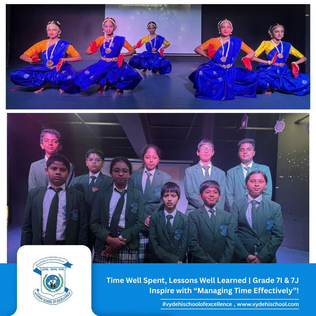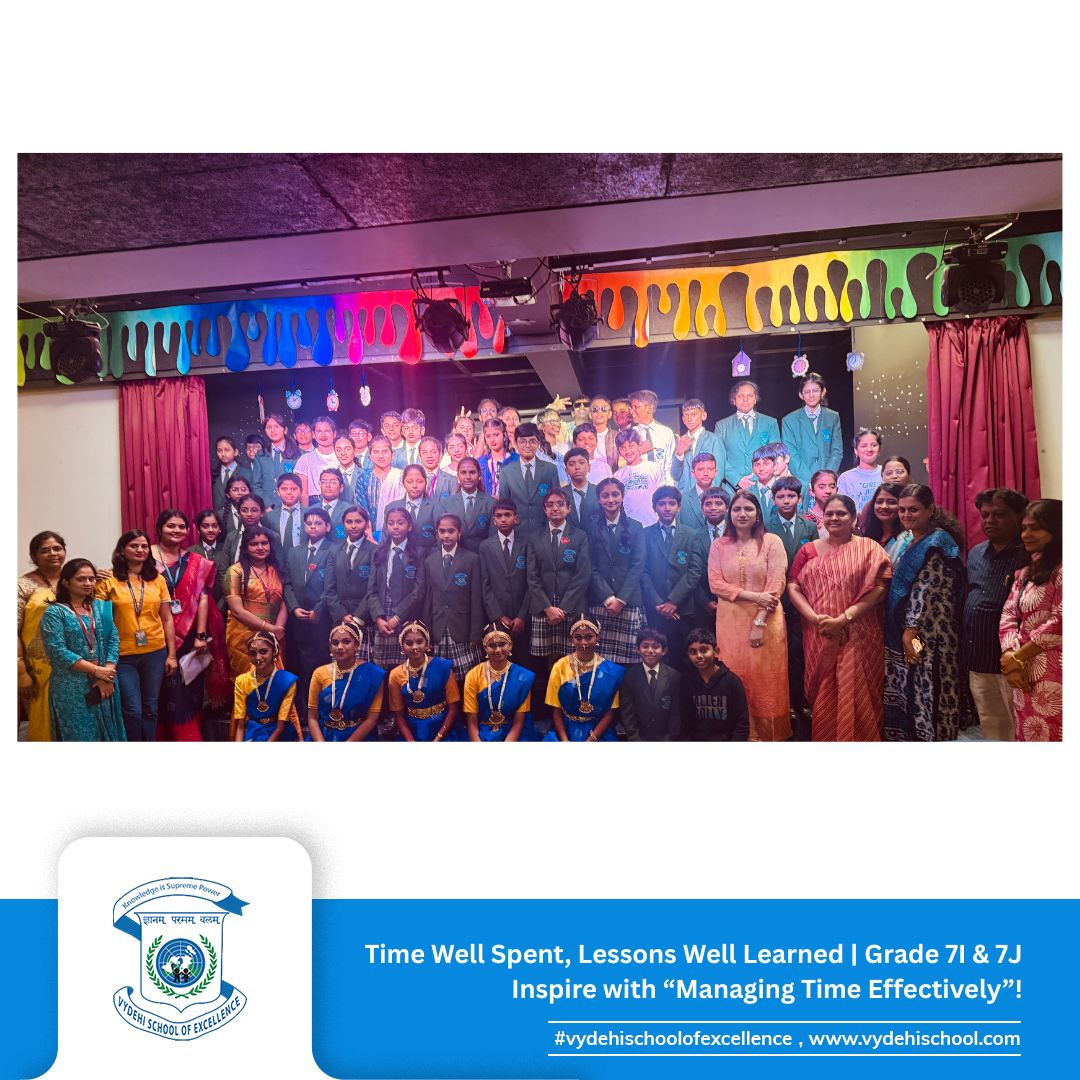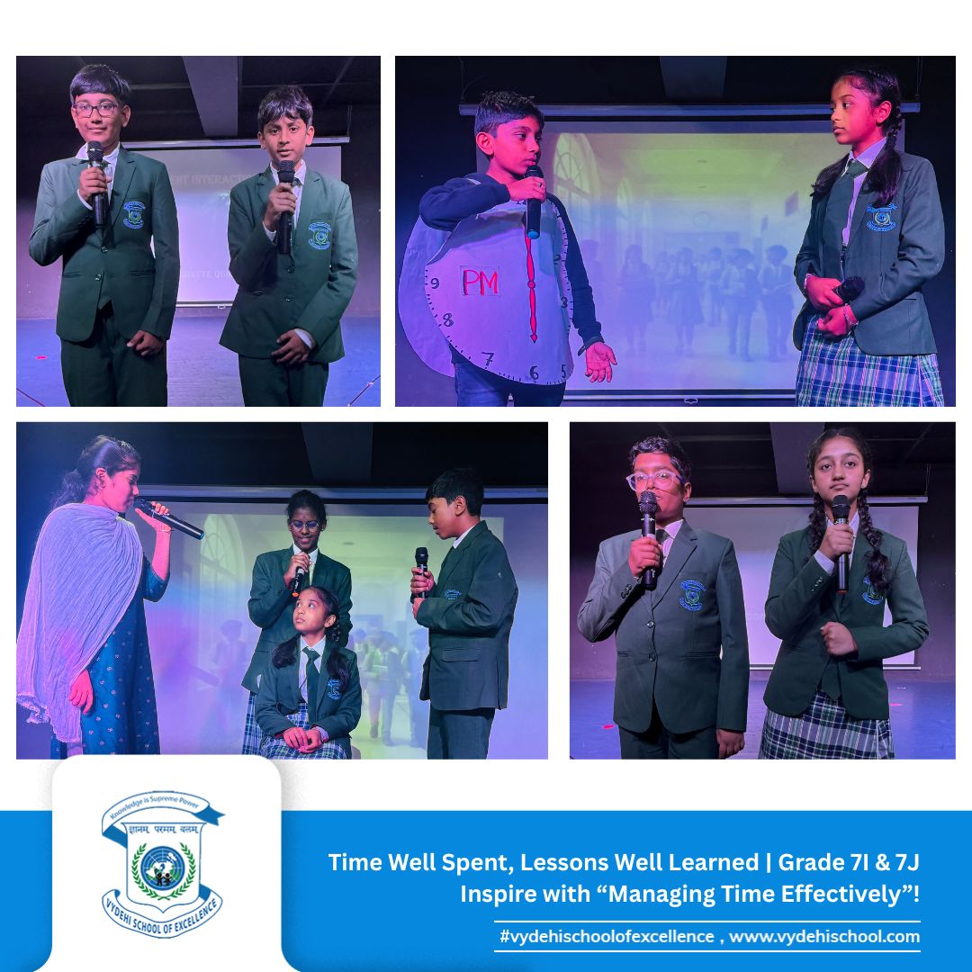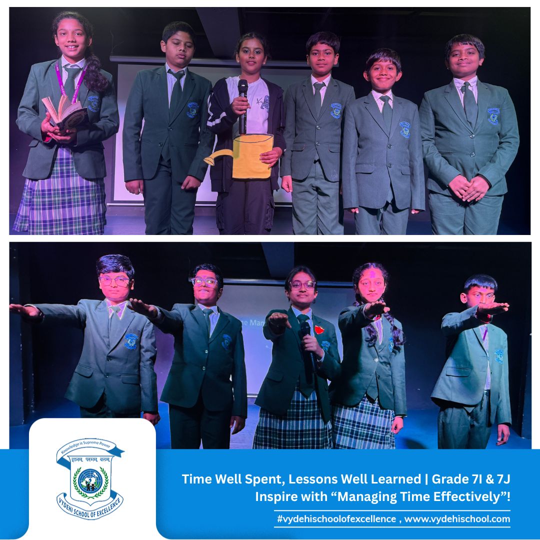 The responsible and dynamic students of Grade 7I & 7J at Vydehi School of Excellence presented a captivating Special Assembly on the theme “Managing Time Effectively: Prioritising Your Tasks and Responsibilities.” ⏰📚
