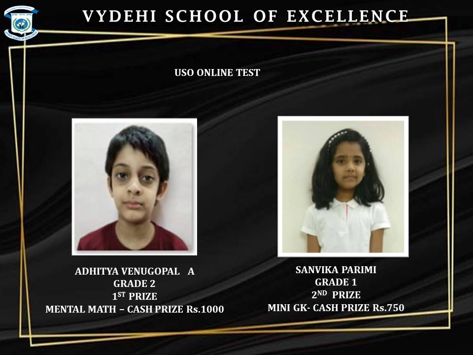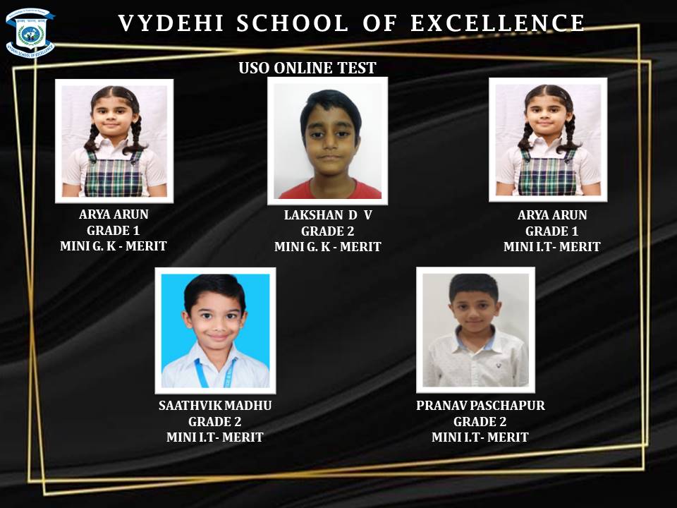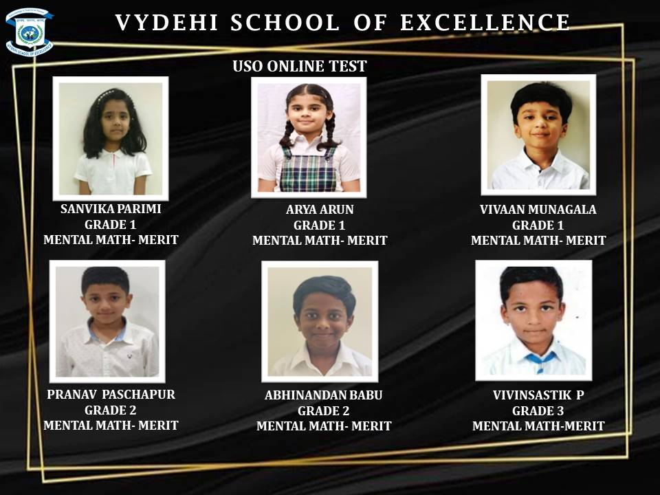 We are proud to announce that AryaArun, VivaanMunagala of Grade 1 and PranavPaschapur, AbhinandanBabu, Lakshan DV, SathvikMadhu from Grade 2, and Vivinsastik of Grade 3 participated in USO ONLINE TEST and were awarded certificates and medals.