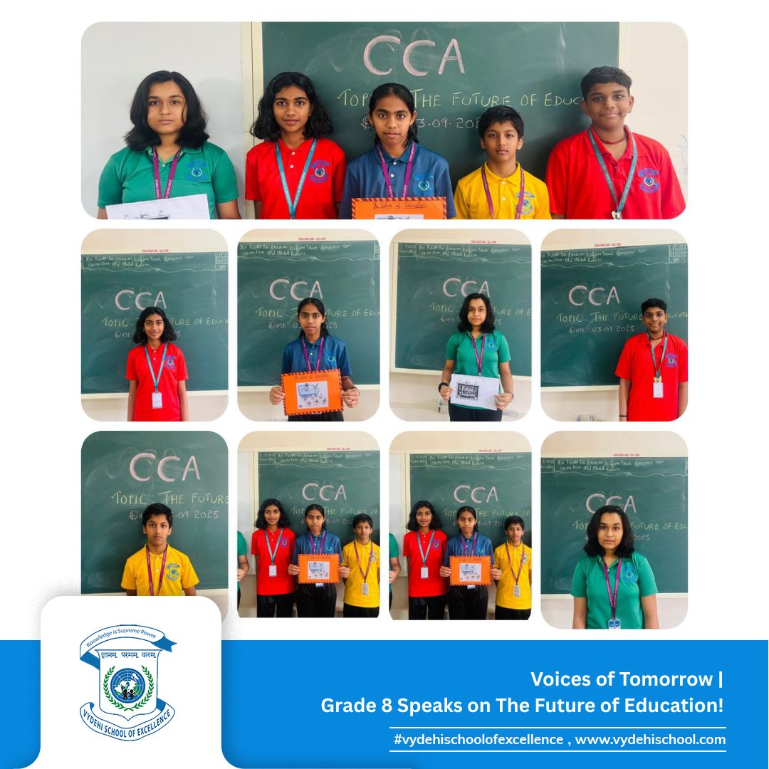 On 3rd September 2025, our brilliant Grade 8 Vydehians took the stage for a thought-provoking CCA event on βThe Future of Education.β ππ From AI-powered learning to personalised classrooms, from life skills to inclusivity, students confidently shared their vision of how education will evolve. Their speeches reflected innovation, awareness, and a passion for shaping a brighter future. π‘